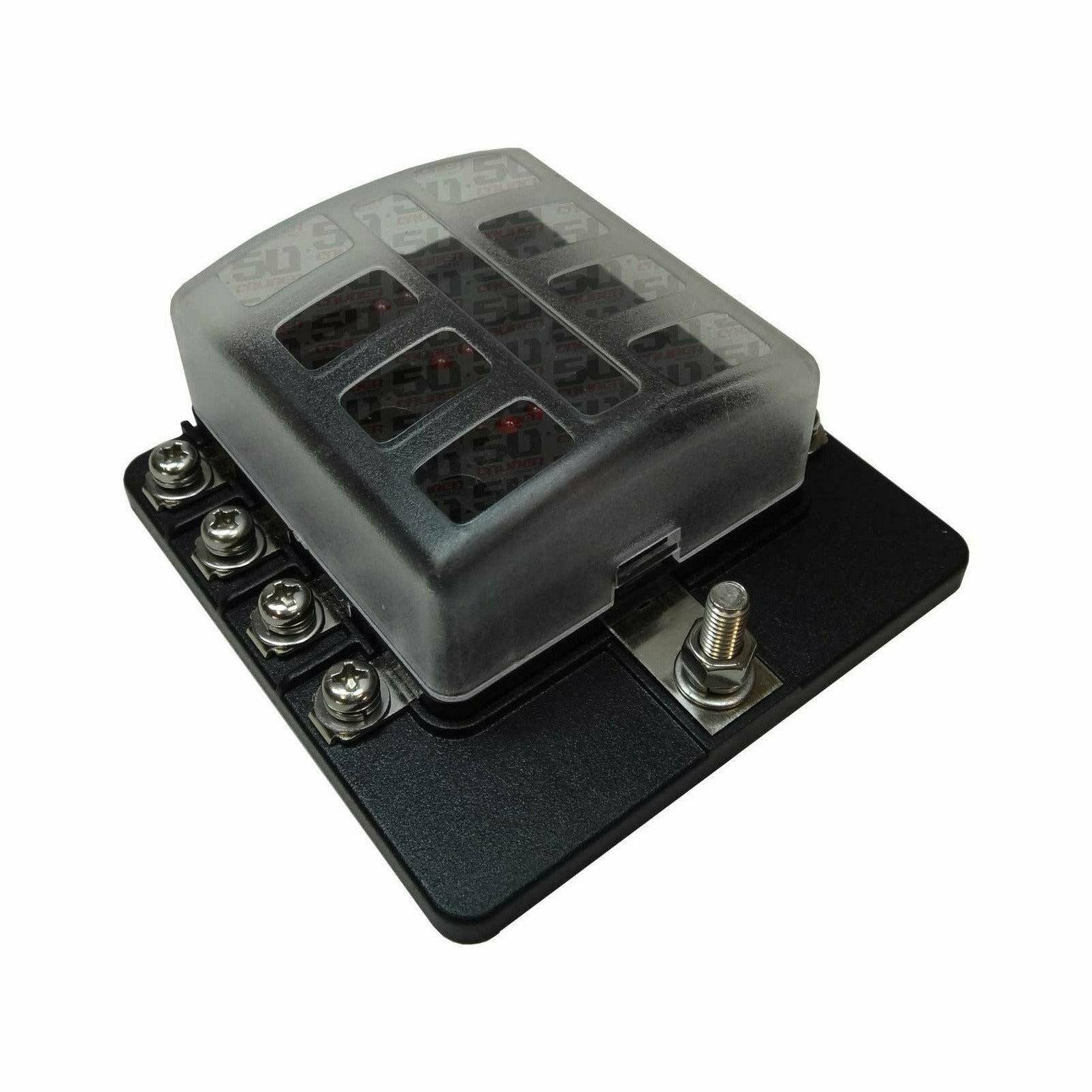Universal distribution block, with LED indicators for all circuits and opaque plastic cover. This fuse box is suitable for all kinds of automotive and marine applications, including 6V, 12V & 24V systems (maximum voltage 32V). Each fuse holder is designated a custom label for identification and to make fuse installation as easy as possible. The fuse box is also equipped with red LEDs that illuminate when a fuse is blown making it easy to identify blown fuses. Locking screws for ring terminals on output side. Includes an assortment of blade fuses, sticker sheet of labels and mounting screws.