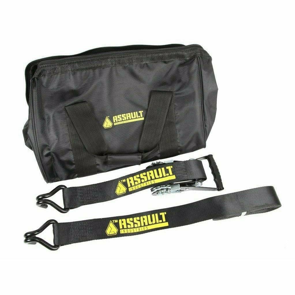 Each of the 4, 16ft (4.8m) long included straps have a 1,500lbs working load. Each strap kit comes with an Assault Industries storage storage bag to keep your gear neat and tidy. Assault Industries branding is printed on the black straps and bag. Secure your stuff with the best!