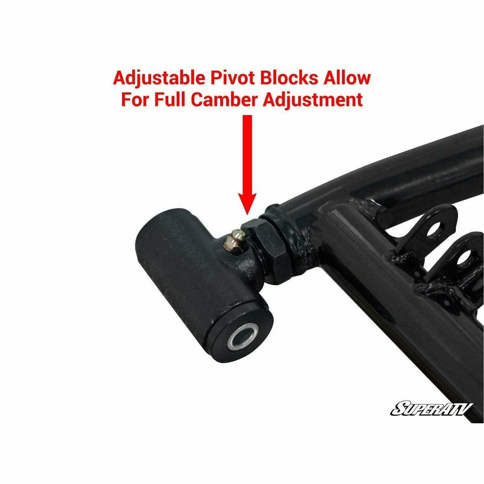 These SuperATV A-arms feature industry-leading adjustable pivot blocks, giving you full camber adjustability. Why would you want control over your camber? Simple—everything from adding an extra passenger to adding a lift kit can totally throw off the feel of your ride. With the ability to adjust your camber as needed, you’re able to keep the same familiar feel that you’re used to. Don’t want to mess with adjustments? No problem. They come pre-adjusted to stock specifications right out of the box, so you only have to make changes if you want to.