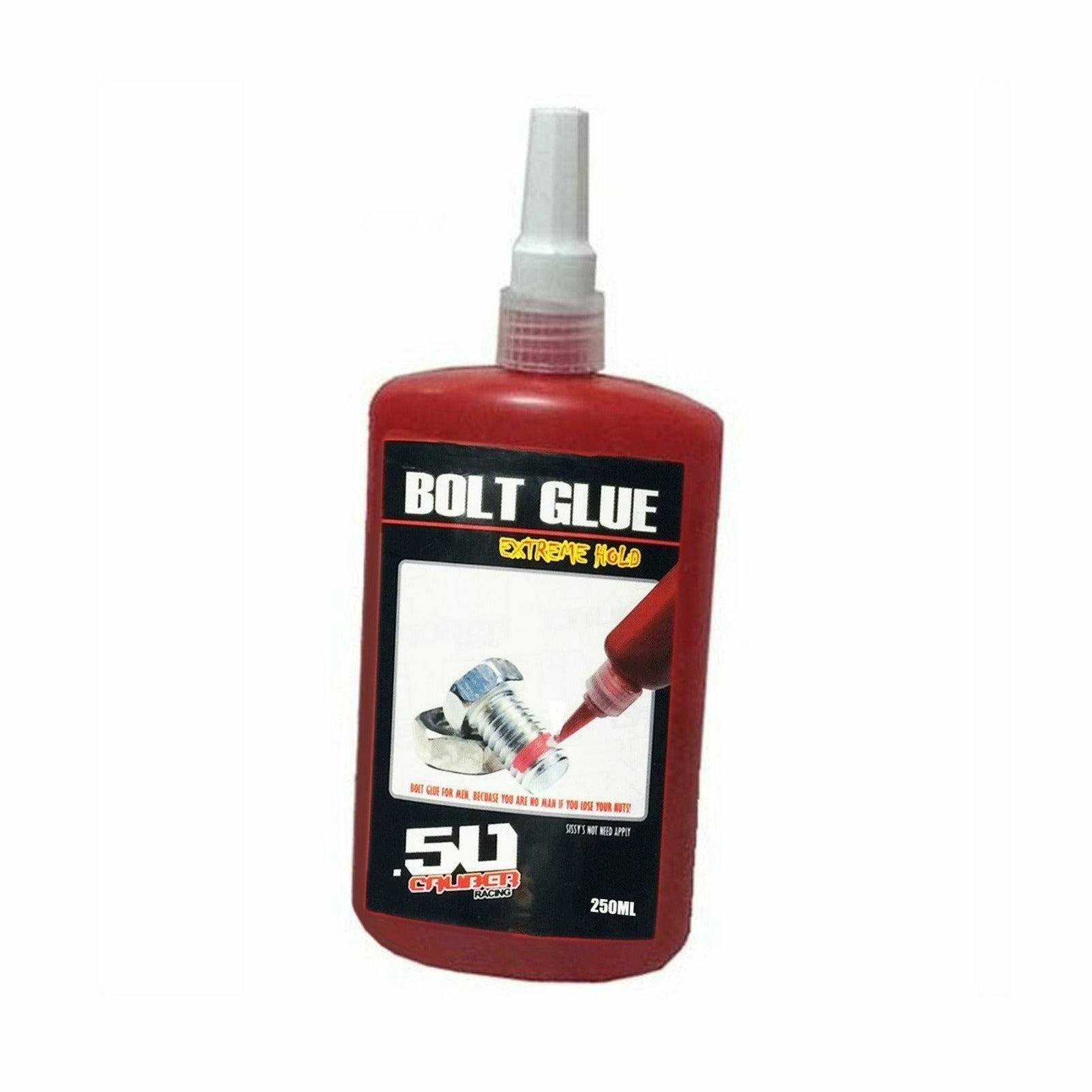 Red Bolt Glue 250ml bottle high strength thread locking glue. This is a bolt glue by 50 Cal Racing. Its purpose is to keep your nuts and bolts together! Its excellent for engines or any nuts and bolts that get vibration. If you are tired of nuts and bolts rattling lose this is your solution!!!