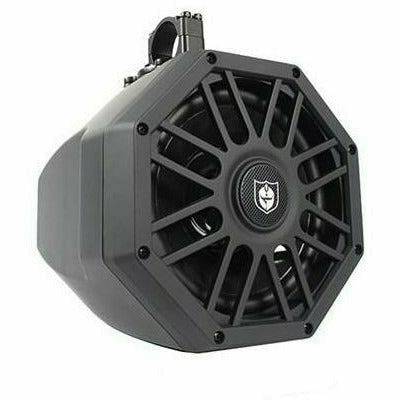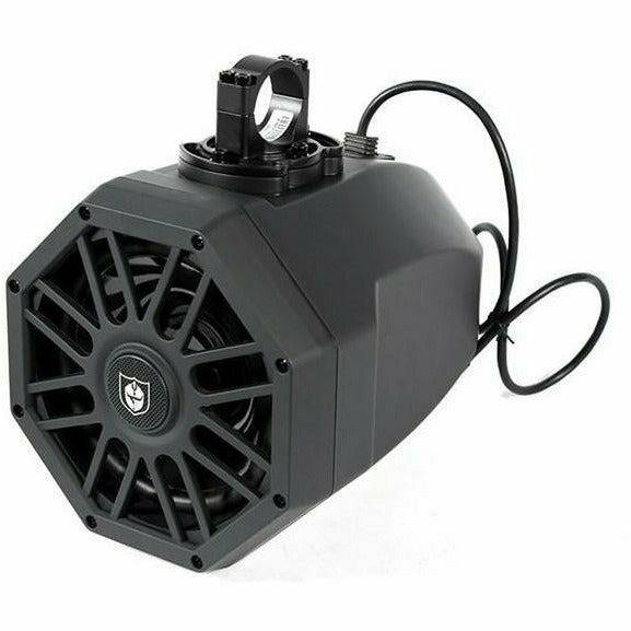 Pro Armor new pod speakers are designed to sound incredible while playing very loud. Built to last with heavy duty cast enclosures that feature an 8 sub and 1 tweeter powered by an internal amplifier. Our speakers offer red and blue illumination with steel reinforcements to ensure protection against the elements which make them a perfect solution for SxS. The low profile rubber isolated mounting system allows for adjustable focus for all tower and roll cage size options. Sold in pairs complete with water resistant connections and mounting clamps. Needs a Bluetooth® controller to operate such as our Pro Armor® Bluetooth® controller for a simple stylish and easy system install.