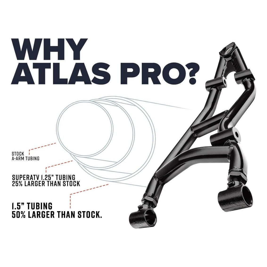 The weekend's here, and you're going from work to play in your Can-Am Commander 1000. Yes, your Commander is a brute of a machine, but are your stock A-arms a match for the rough trails you’ll be riding on? We've designed these Atlas Pro A-Arms for your Can-Am Commander 1000. They’re powerful and brawny—boosting your clearance and giving your machine that “bad-to-the bone” look. Our 1.5" diameter tubing improves on the design of our standard offset A-arms and measures in at 0.5” larger than stock. Plus, you get a 1.5" offset for more stability and room for 31" tires.