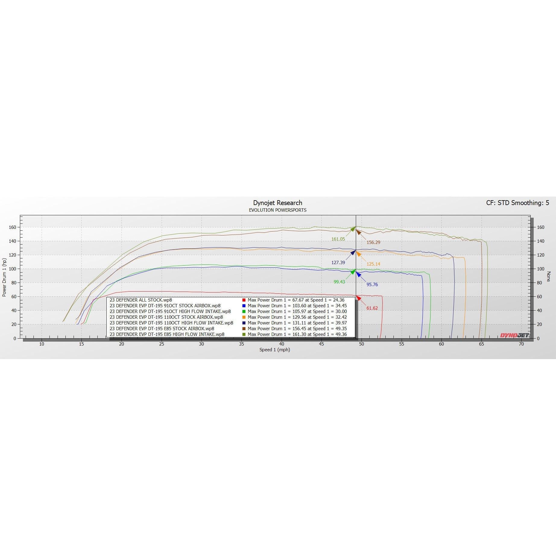 - TWO KIT OFFERINGS: DT-195 with stock airbox, or DT-195 with EVP HFI (High-Flow Intake) Kit + appropriate tuning