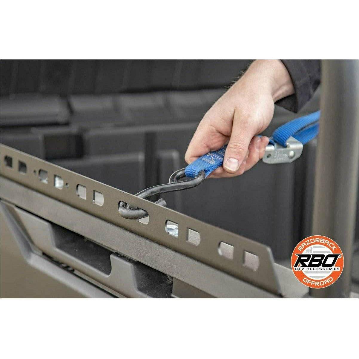 We also offer an optional spare tire mount RBO1074-D Defender Spare Tire Mount that has 2 different mounting options inside of the bed and holds many different sizes of tires. When it comes to securing items in the bed of your Can-Am® Defender, we made it simple by building 16 tie-down points into the Can-Am® Defender Bed Rails. These rails are an integrated part of the RBO Can-Am® Defender Storage Rack so they have the strength to keep cargo in its place. This is one tough Can-Am® Defender Storage Rack. We built the sides from 1.5” steel tubing and then powder coated them in our Tuff Coat Black Finish. The upper Cargo Tray is made from High Strength Marine-grade aluminum and has an inside dimension of 18-3/4” deep x 52” wide and 4” Tall.