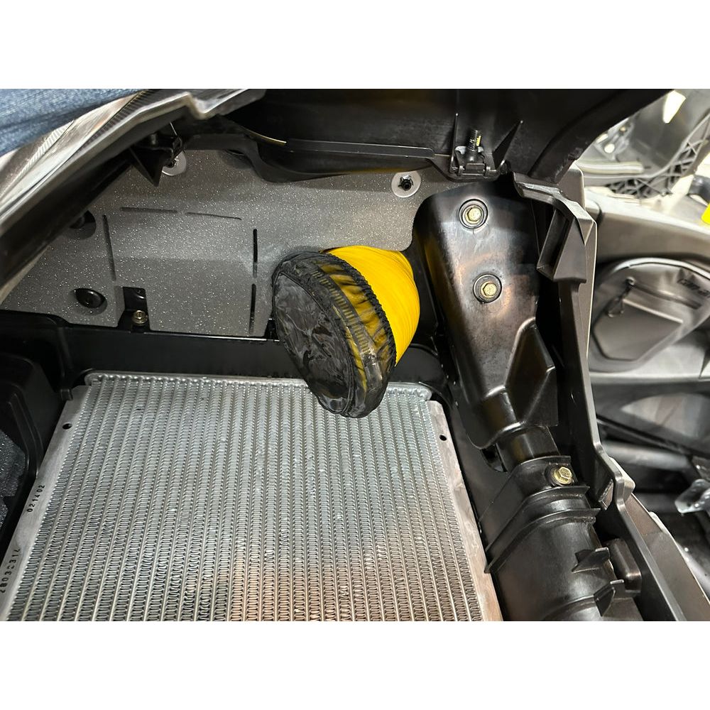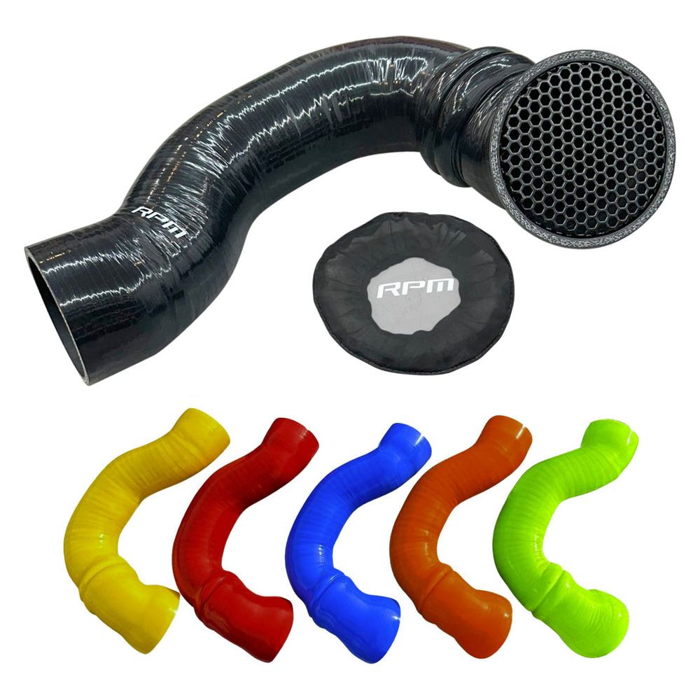 The RPM BIG FATTY Intake tube for the Maverick R is unlike any other and has like previous models, paved the way for the industry. This intake does not only lead with durability but its construction itself is just simply art. Starting at the airbox it uses the factory Oetiker clamp where the silicones interior construction is equal to the ID of the airbox to create a seamless, free flowing path of air. Moving up construction of the tube, we have swept the intake tube further away from the intercooler end tanks to prevent any heat soak or potential increase in intake air temps. Entering the factory intake "box" or intercooler area we have drastically enlarged the intake with a venturi style intake ring allowing for increased air flow and increased intake air speed. We've angled the venturi ring slightly back and downward to prohibit the intrusion of debris such as dust, sand, and large foreign object from reaching the intake. We didn't stop there though, we also incorporated our RPM Debris Cage. This hexagonal grate prevents the entrance of large objects such as leaves, sticks, mud clumps, etc. from entering the intake system, prolonging filter life even further. To top it off and let the industry know who leads this market we provide the RPM Debris Cage and a hydrophobic RPM Pre Filter repelling water, sand, and other small unwanted particles from even making it to the air filter.