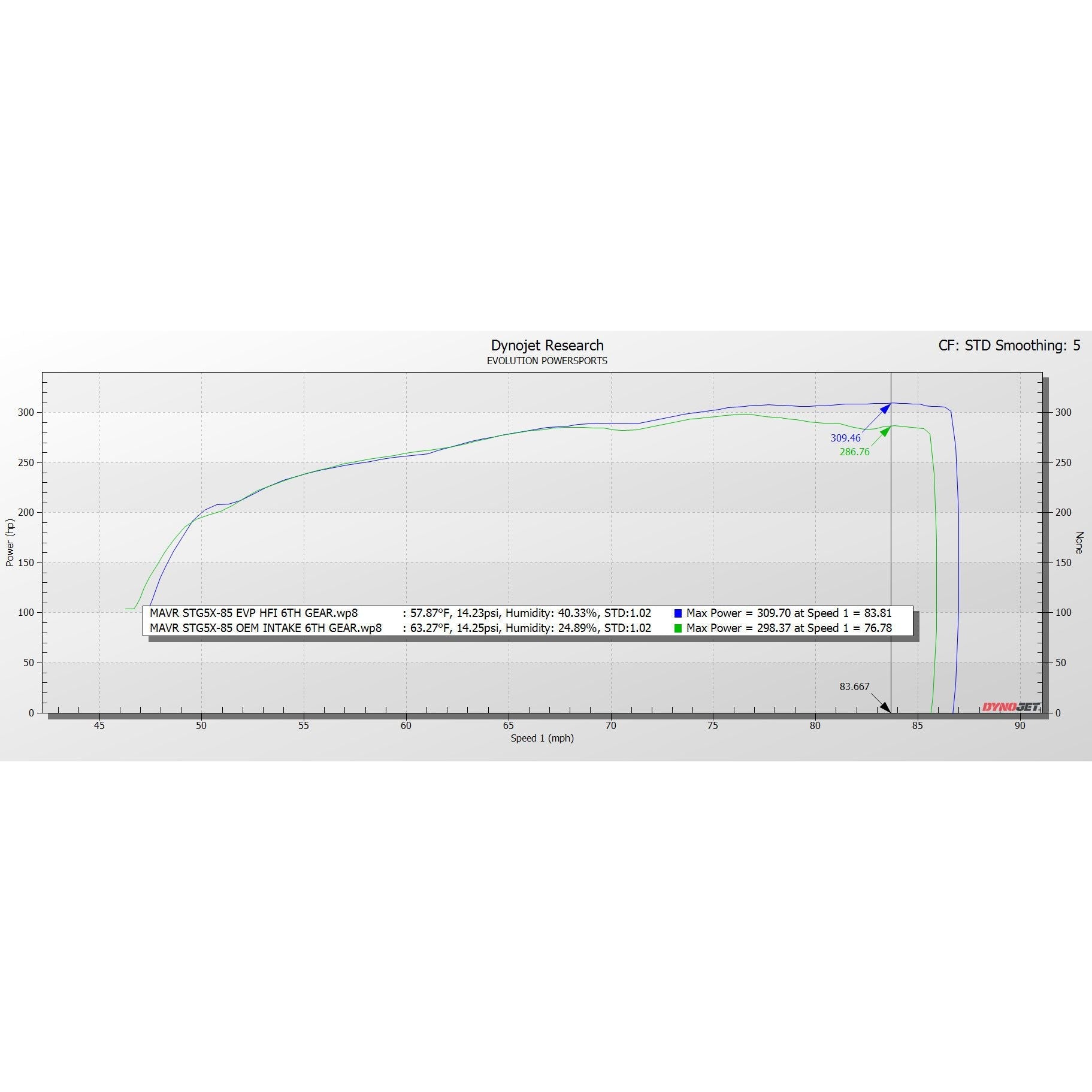 Extend your engine's power output potential with the all-new EVP High Flow Intake (HFI) Kit for the Can-Am Maverick R! From EVP's experience in the off-road industry and from Todd's Supercar days, we have seen where the OEM intakes are not ideal for higher-than-stock power. The OEM Donaldson-style intake works well but is restrictive. The short intake tube from the airbox to the turbocharger does not have time to properly smooth out the flow of air entering the turbocharger. This leads to a reduction in efficiency and power loss. As the engine’s airflow demands increase with tuning and/or higher than stock rev limits, the more important a free-flowing intake becomes. The EVP HFI solves these issues providing up to 23 WHP* over the factory airbox at 9000 RPMs on our X85 DCT+ tune!