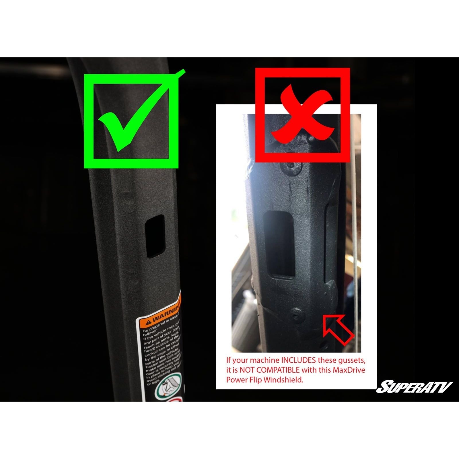 - Some machines include gussets on the A-pillars surrounding the rectangular wiring portal (wiring portal can be found a few inches below the roof on the cab-facing side). If your machine INCLUDES these gussets, it IS NOT COMPATIBLE with this MaxDrive Power Flip Windshield, please see photo above for reference.
