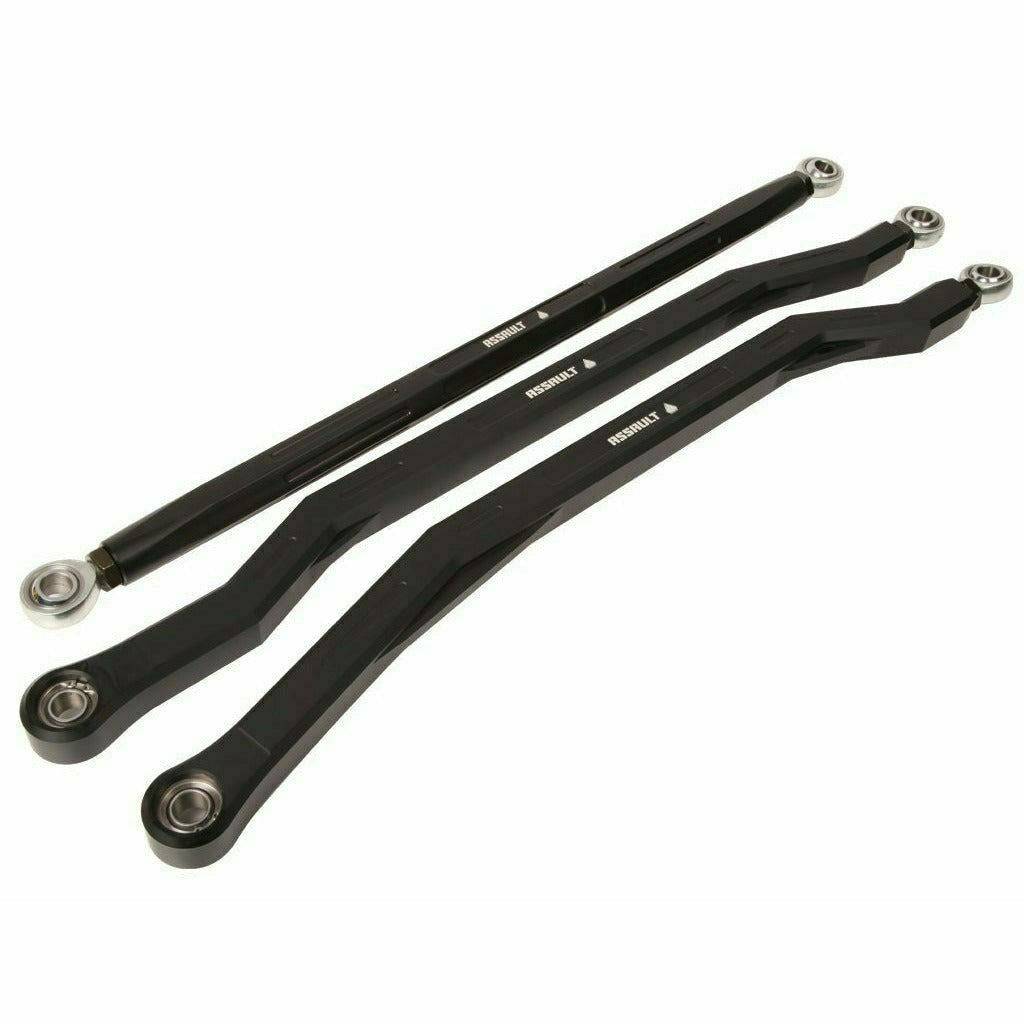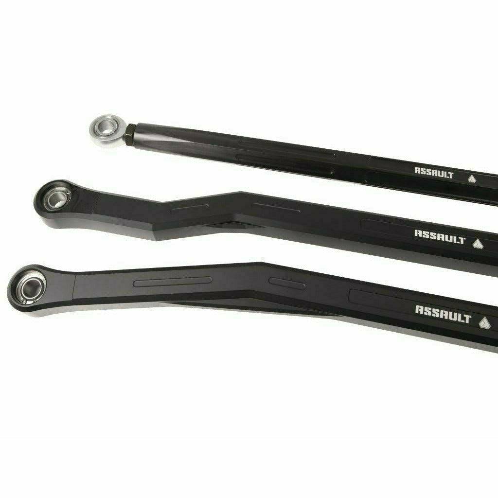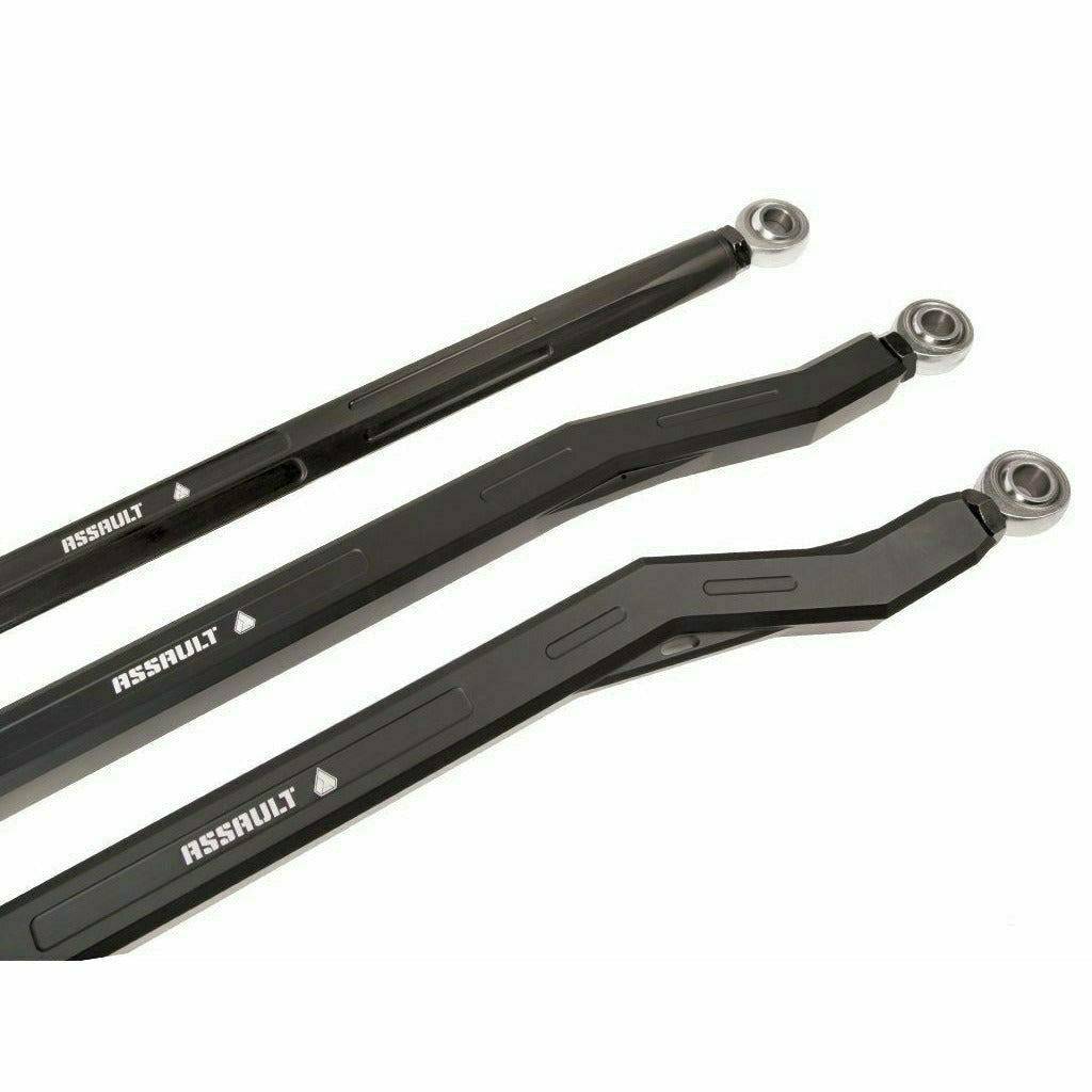 This kit provides an additional clearance for your UTV's rear suspension on uneven terrain. Assault Industries high clearance radius rods are machined from 6061 T6 aluminum and hard anodized black with polished, adjustable end-links.