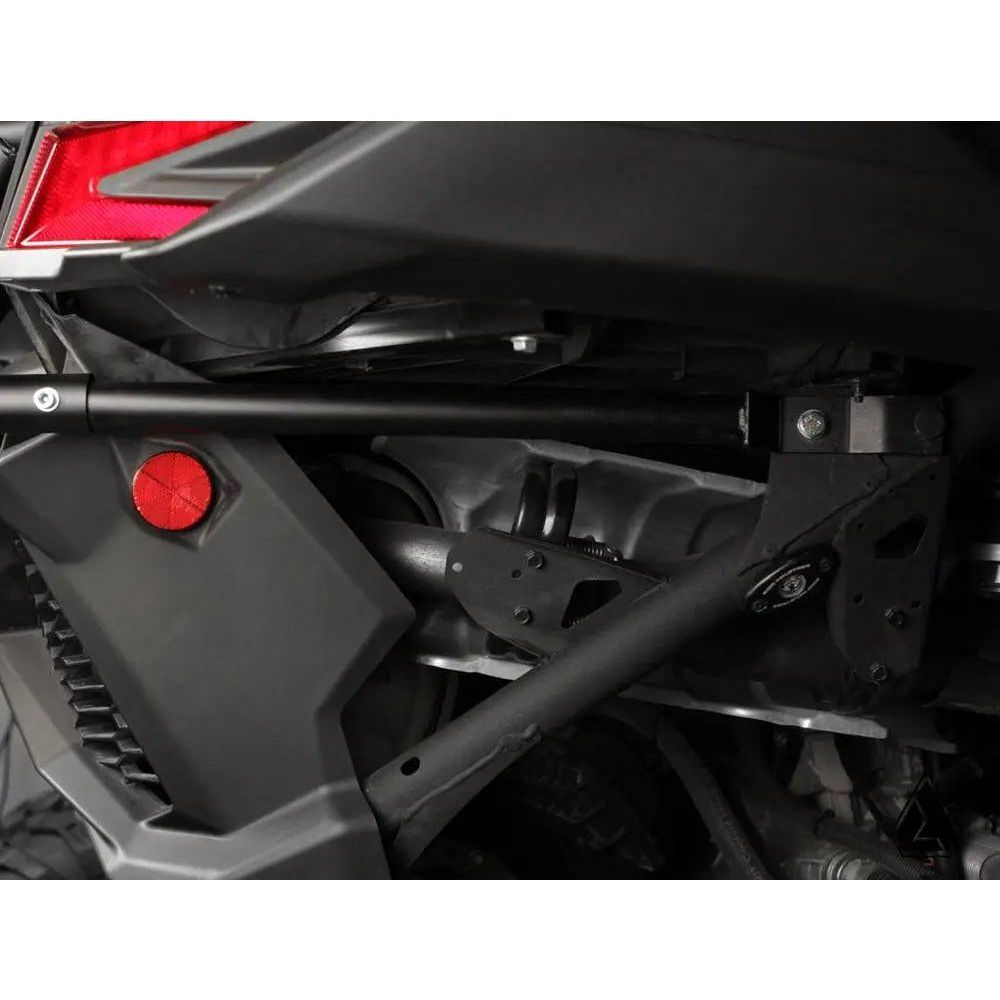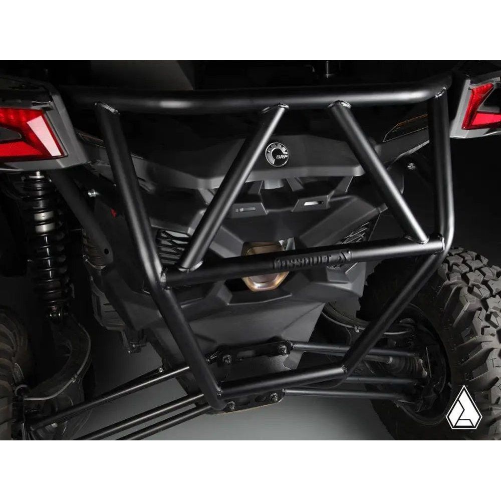 The Assault Industries F-22 rear bumper adds protection and style to 2 and 4 seater Can Am Maverick X3 vehicles. The bumper is made from mandrel bent steel tubing, welded and powder coated satin black.