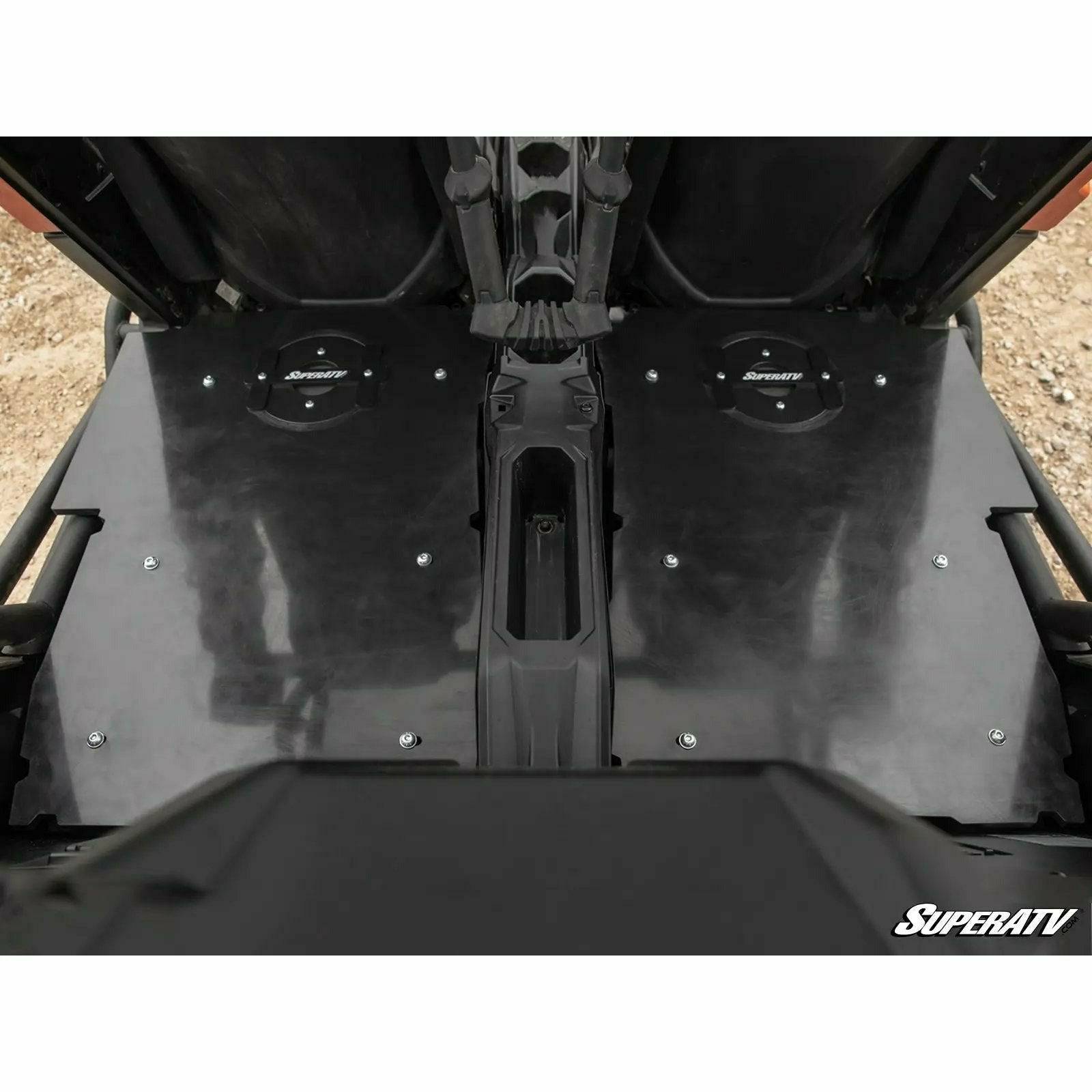 Our Can-Am X3 rear seat conversion kit comes with two 1/2” UHMW panels and gives you the option to replace one seat or both. The panels bolt securely to each seat base and have convenient notches to hook ratchet straps into. It also includes pop-out hatches to give you quick access to the floorboards for even more cargo space. But we didn’t forget about your pup—this kit doesn’t block your seatbelts so you can still use your dog’s seatbelt harness.