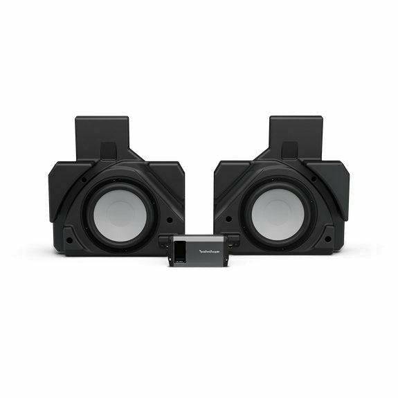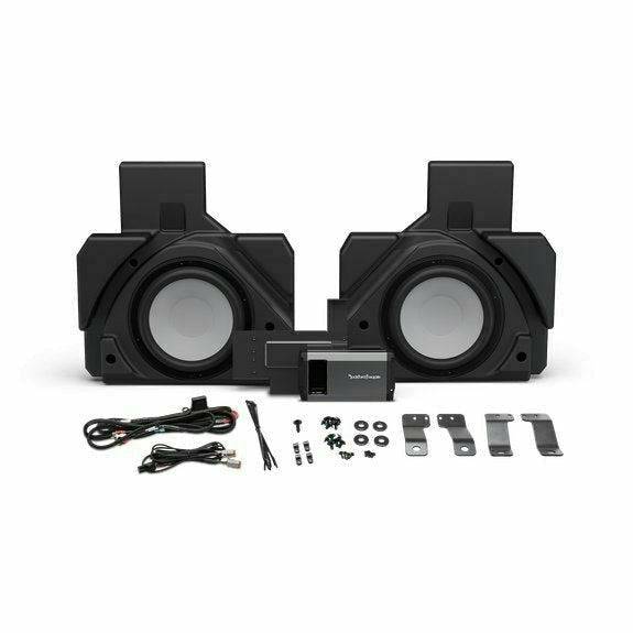Plug-n-play system easily integrates into existing Rockford Fosgate aftermarket audio systems. Audio system is 100% Element Ready™ solution and provides ability to take your off-road vehicle into any environment. The subwoofer enclosures mount underneath the rear driver and passenger seats, and the amplifier mounts inside the rear center tunnel. Amplifier also employs the Rockford Fosgate PRESET switch for easy set-up, allowing maximum performance without any tuning. System features a plug-and-play design and does not require any cutting or drilling of vehicle. A step-by-step install video is available for DIY installations.
