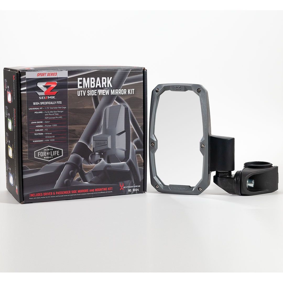 Mount the mirror in a traditional upright position or mount it inverted to accommodate the field of view your work requires. Equipped with safety features like breakaway geometry, impact resistant thermoplastic housing, a full perimeter bezel mirror guard, and shatter resistant and replaceable safety glass, the Embark mirror will withstand the punishment your UTV faces while out on the trail, in the fields, or wherever your work or play takes you. Designed to break away during impacts to prevent damage. Provides rotation for mirror housing which allows wider range of installation options across many different cages. May be mounted in the traditional upright position or in an inverted position based on your preference. Convex mirrors more than double your field of view behind the vehicle.