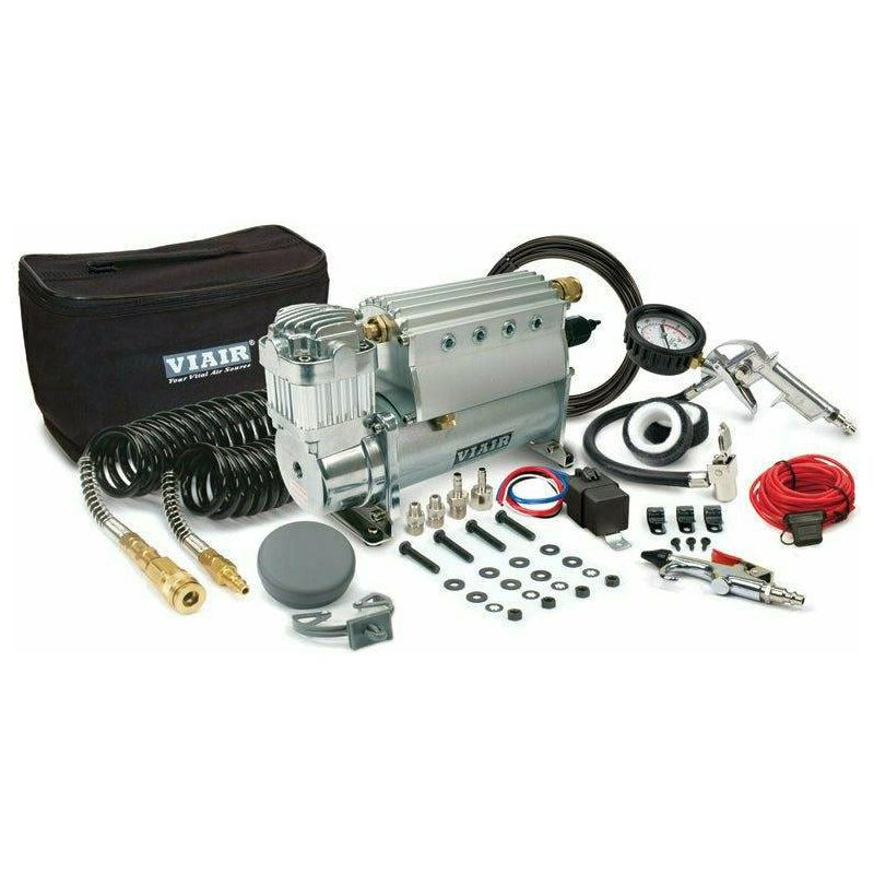 VIAIR’s Escapade Heavy Duty Compact Onboard Air System is a compact, pre-packaged compressed air solution that features an industry-leading, 150PSI rated, 33% duty 400C compressor, an extruded aluminum tank, and all components needed to install a working system capable of tire inflation and air locker actuation. This OBA System comes complete with an onboard pressure switch, automatic coupler and a tire Inflation Kit.