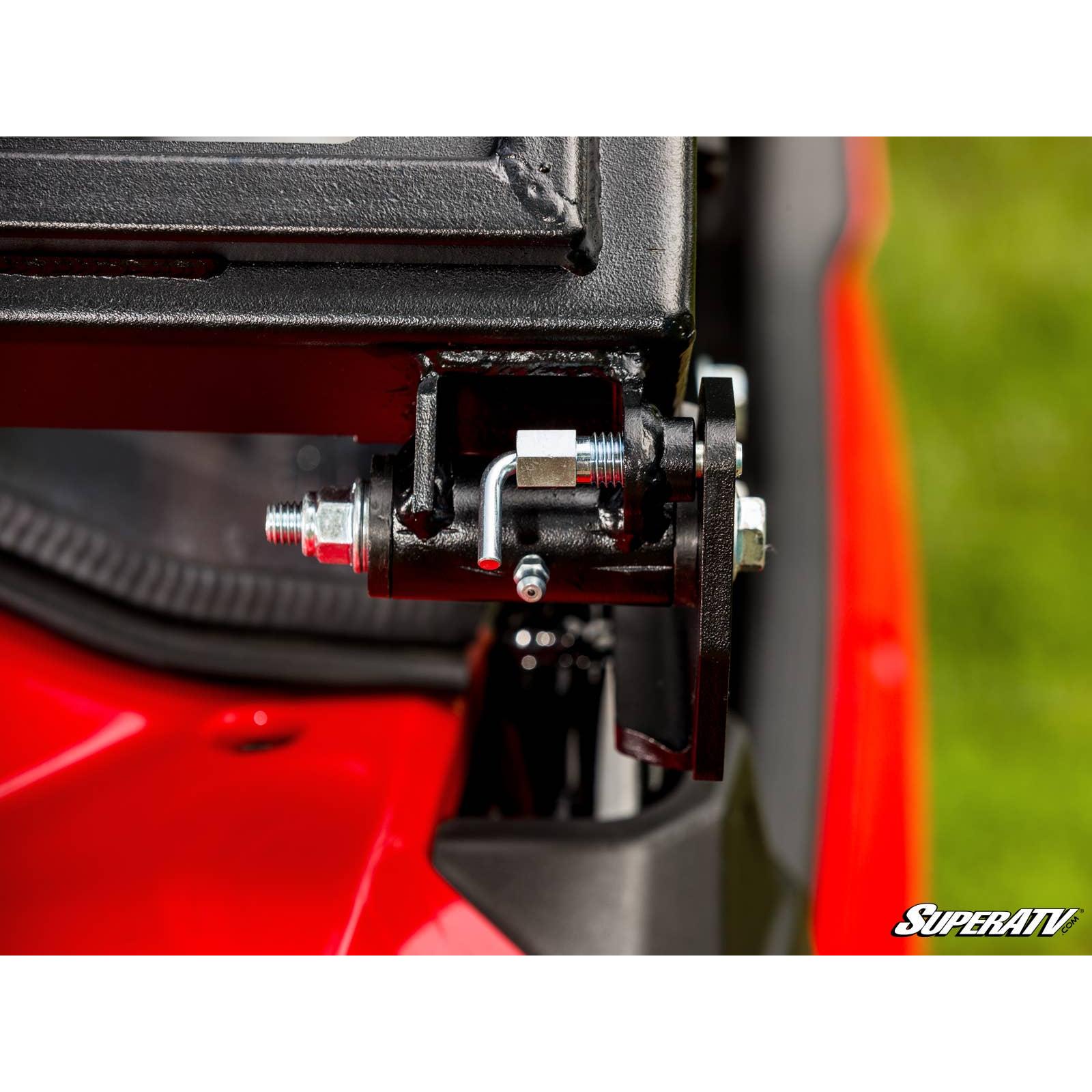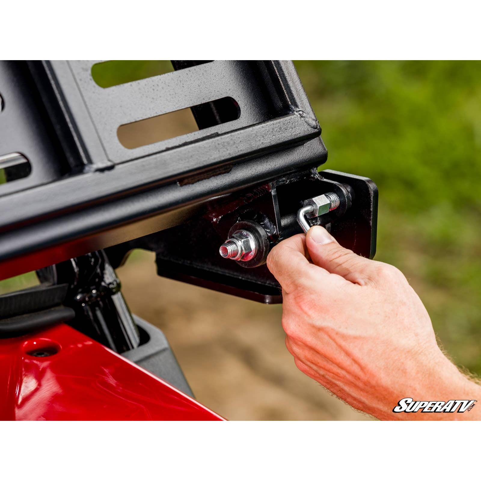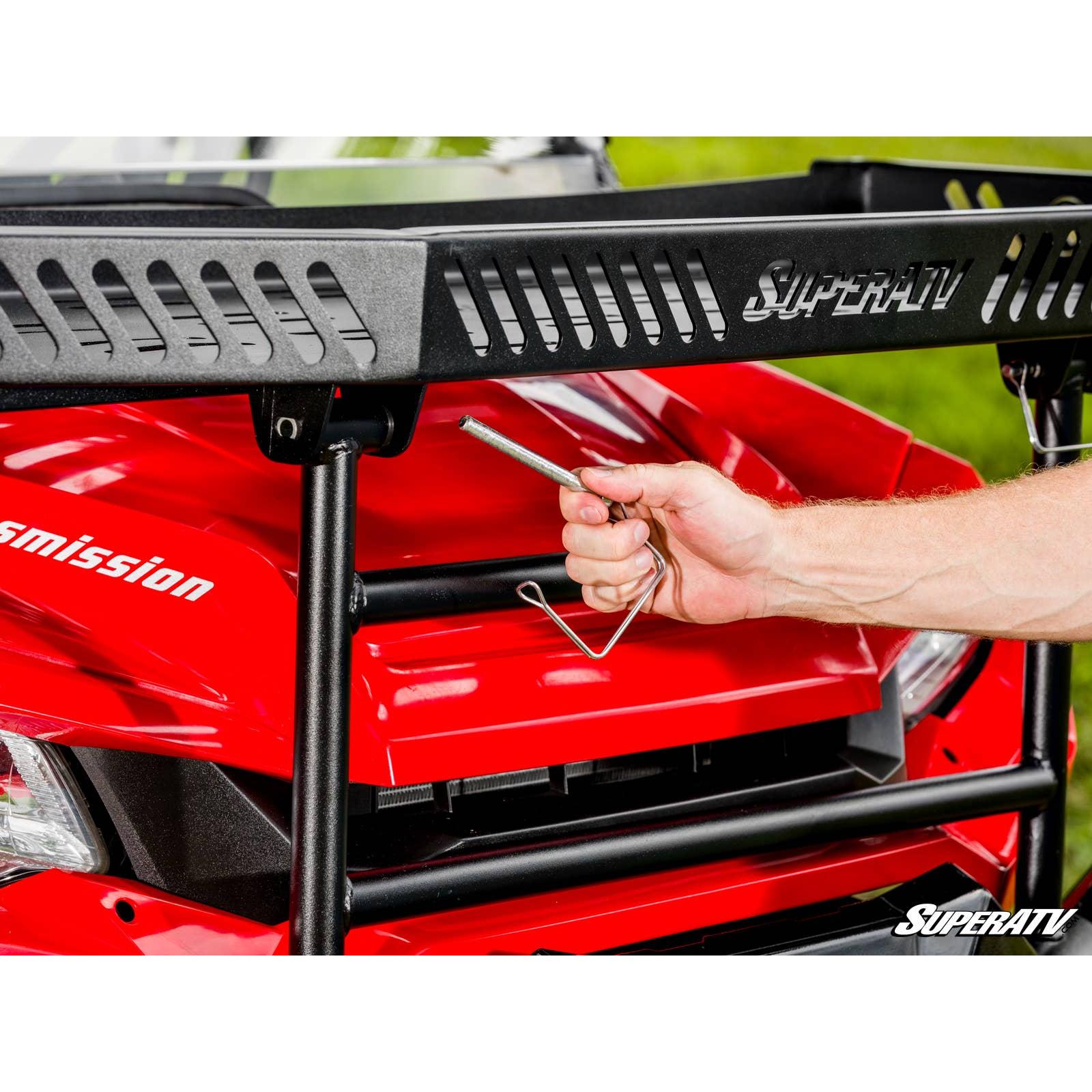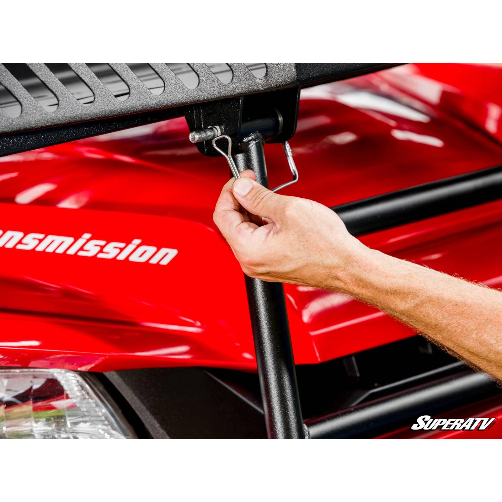 You can’t have a Honda Pioneer hood rack that blocks access to your hood panel. Ours flips out of the way easily. Pull out the two quick-release pins and flip it up. It’ll lock in place so you can get to your hood without breaking a sweat.
