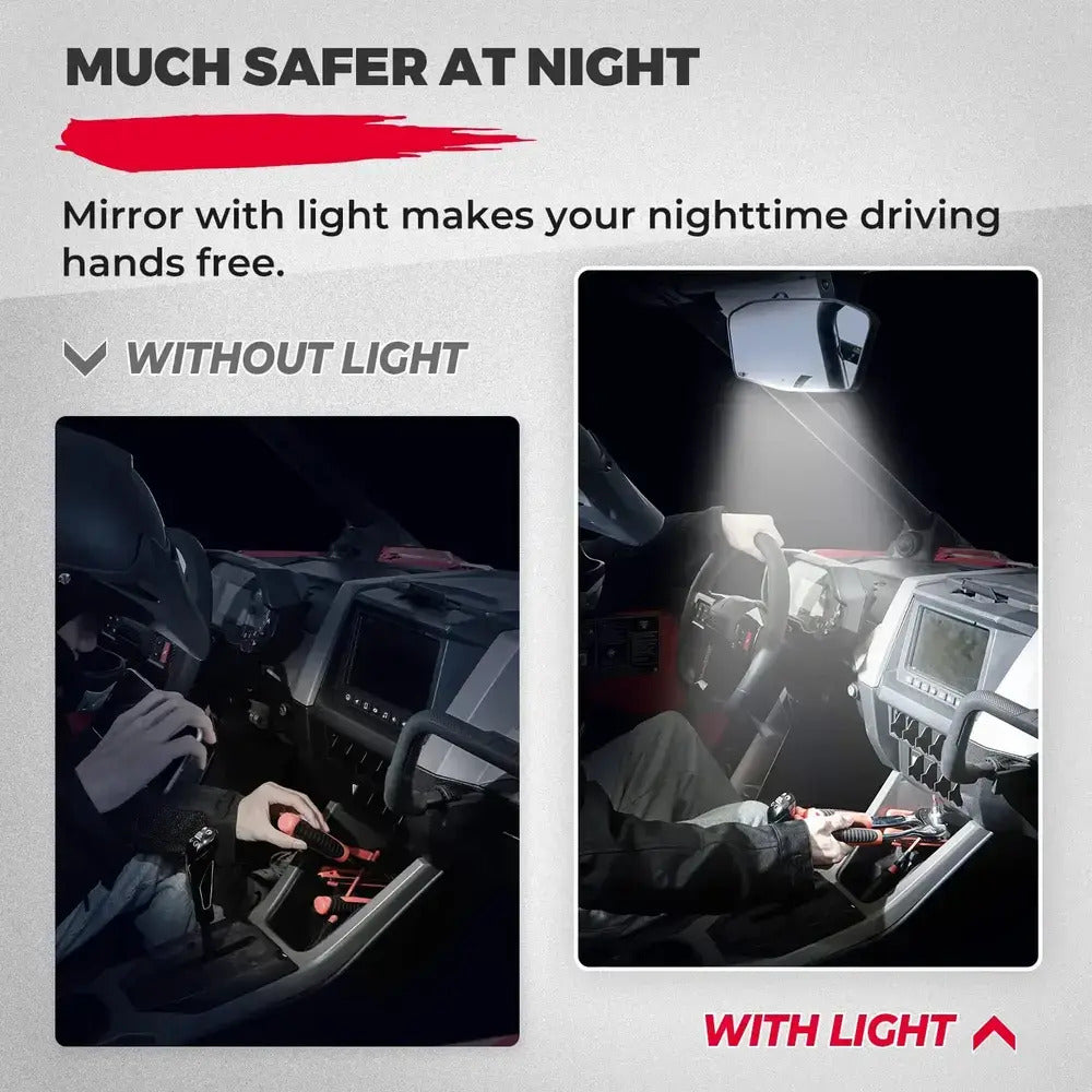 The UTV rear view mirror with lights has a direction-adjustable ball joint, which can adjust the height and angle according to your driving position, perfect for the best rear view