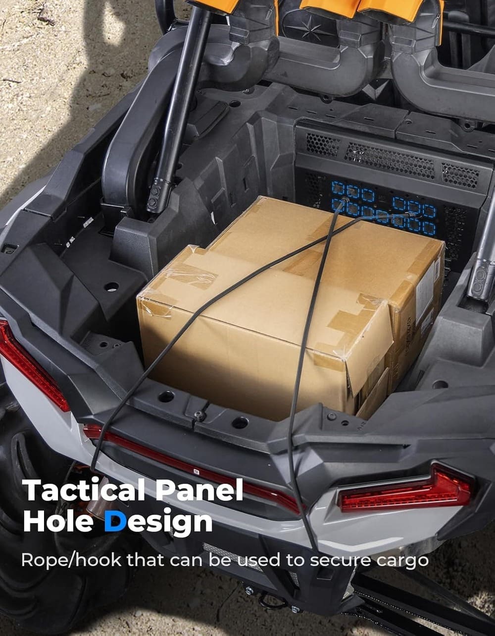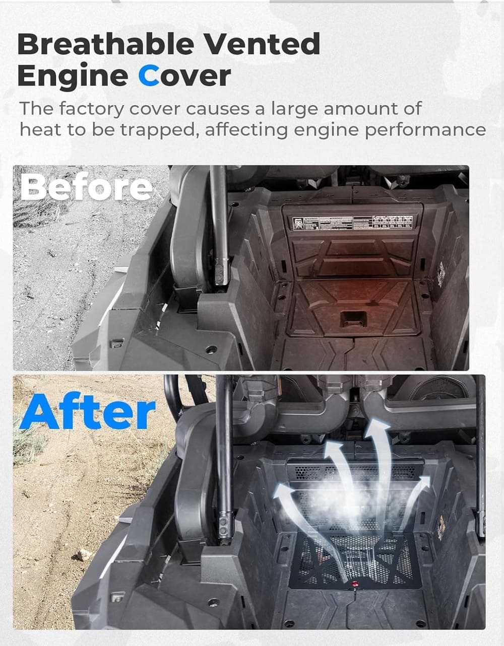 The RZR Vented Engine Cover boosts engine performance by improving airflow and preventing overheating. Made from durable 3mm aluminum, it's rust-resistant and designed for tough environments. Featuring a quick-access switch and tactical panel holes, this engine cover makes maintenance easy and efficient. Explore more to enhance your UTV's engine cooling and functionality.