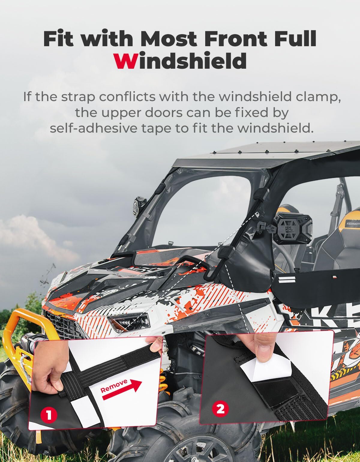 You don't have to worry about the front windshield obstructing the installation of the upper door. The strap can be removed, and then the nearby hook-and-loop tape is attached to the front bar. This upper door is easy to install, it will only take several minutes of your time.