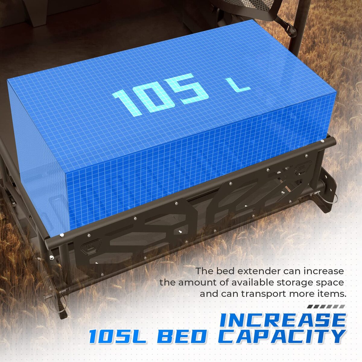 Boost your Honda Pioneer's cargo space with our easy-to-use bed extender! It gives you an extra 105L of storage. Got long items like ladders or trees? No worries! This extender is super strong, made from durable Q235 steel, and can hold up to 60KG. It's a breeze to set up with simple spring clips—just flip it out when you need more room and fold it away when you don't. Its sleek black finish adds a stylish touch to your ride. Make the most of your Honda Pioneer with this awesome cargo bed extender!