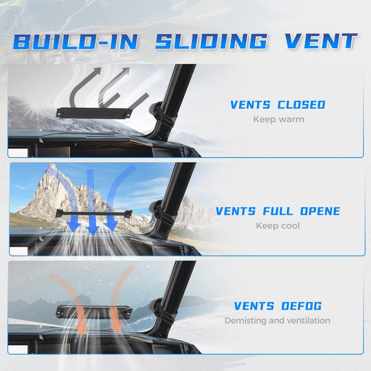 Kemimoto vented windshield allows you to adjust airflow, which you can stay comfortable at all times, such as cool while hot, warm when cold, etc. What's more, the windshield is defrosted function.