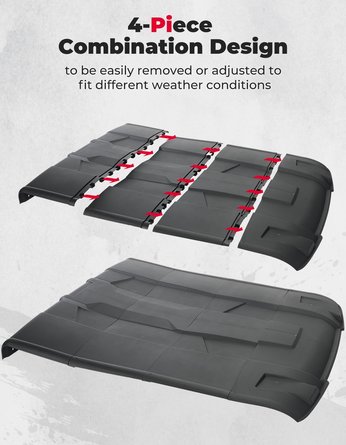 4-piece design roof top for simple, quick installation, removal, and storage. No drilling is needed, and all hardware will come with the crew top. All necessary hardware is included, saving you time and hassle.