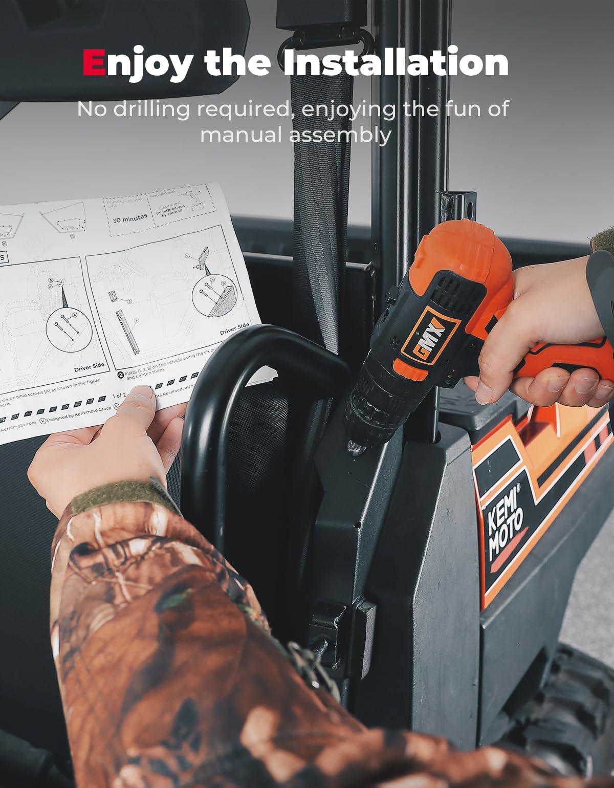 Kemimoto UTV doors come packaged with all hardware and do not require cutting or bending. After assembly, fix it with the original car screws.
