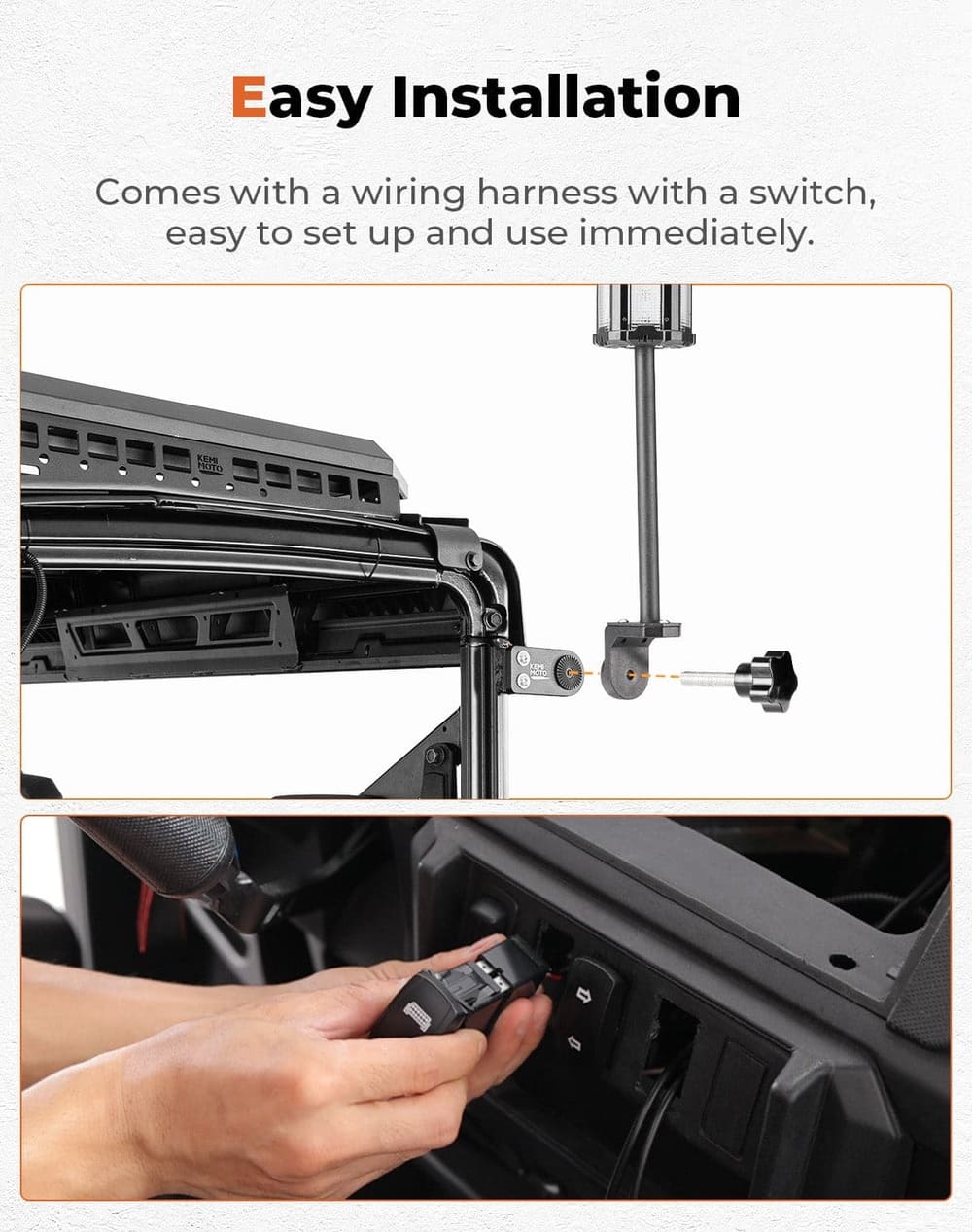 The rear roof light bracket is adjustable to 360 degrees and can be used as a work light, cargo bed light, reverse light, or road condition light, and can also provide interior lighting for your UTV