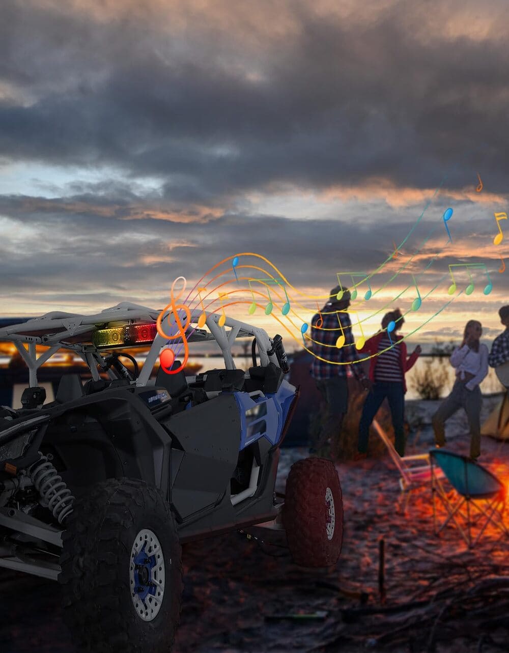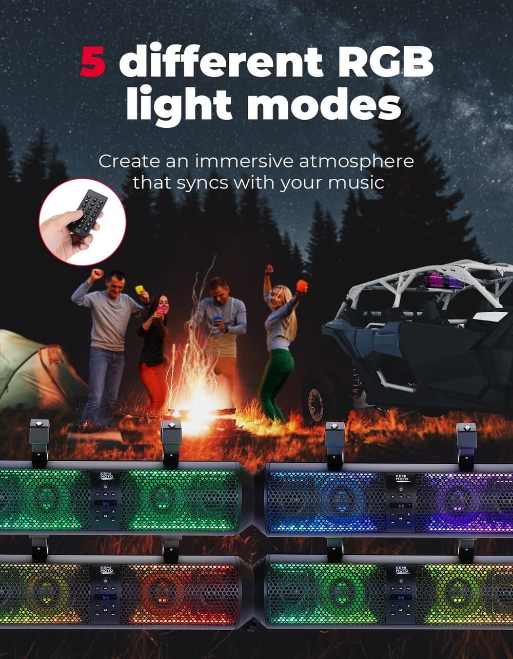 If you enjoy driving your UTV, you should definitely check out the Kemimoto UTV sound bar with RGB lights and bluetooth. This sound bar not only delivers high-quality audio but also features multi-colored lights that flash in sync with your music, creating an immersive atmosphere. You can control these lights using a wireless remote or onboard buttons. Plus, this sound bar is very durable, meeting the IP65 International Standard, which means it is fully protected against dust, oil, and water, so you don't have to worry about any weather conditions.