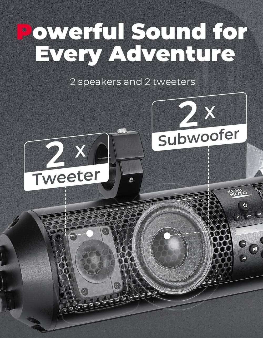 Equipped with two 4'' full-range speakers and two 1'' soft dome tweeters, the KEMIMOTO sound bar is powered by a high-performance 400W to provide you a loud music even during riding.