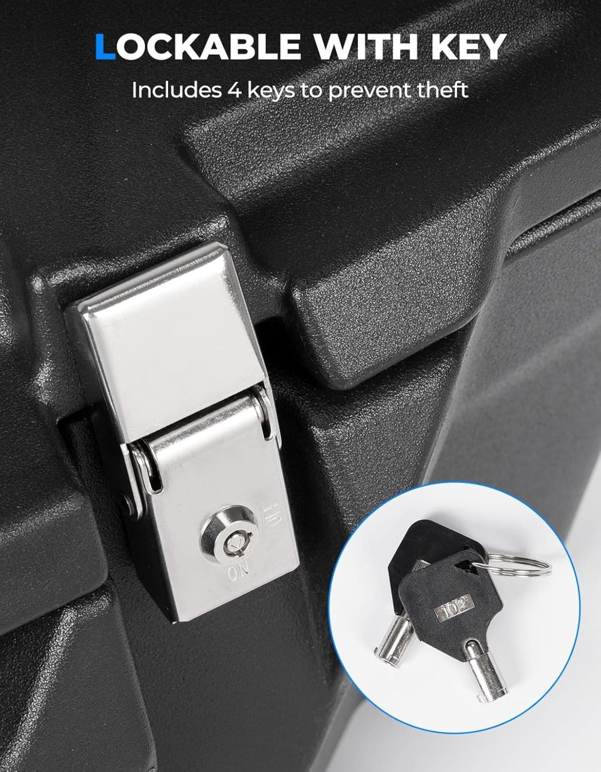 The 100L ( (26.4 Gallons))Storage Bin provides ample room for organizing essentials such as gloves, first aid kits, and tools, along with travel items like repair parts and clothing, making it ideal for long rides.