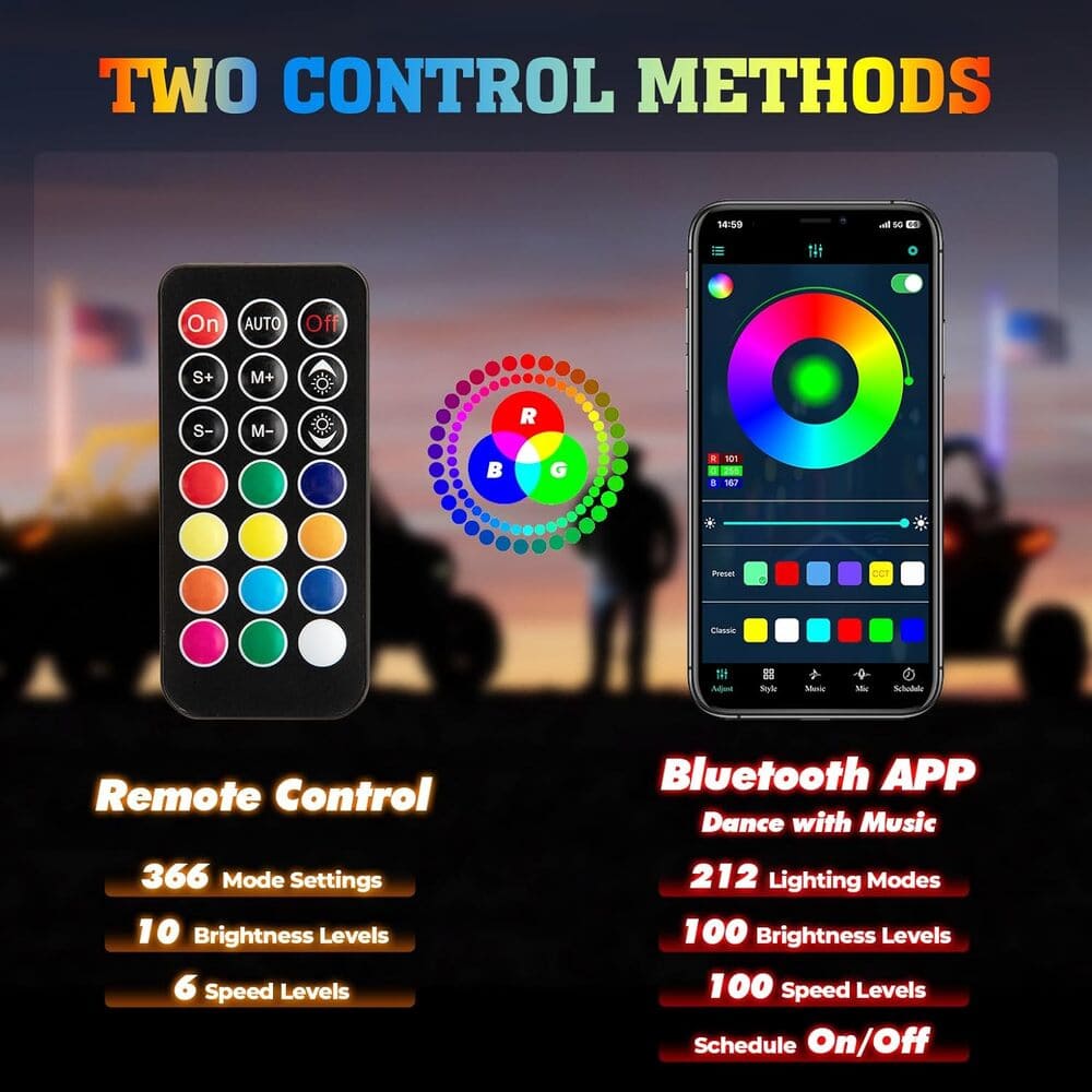 Kemimoto led whip lights 366+ Lighting Modes for utv atv will glow in 360°direction with the spiral LED lights to bright the whole sky. And as an added safety feature, these whips can be wired into your brake lights and turn signals.