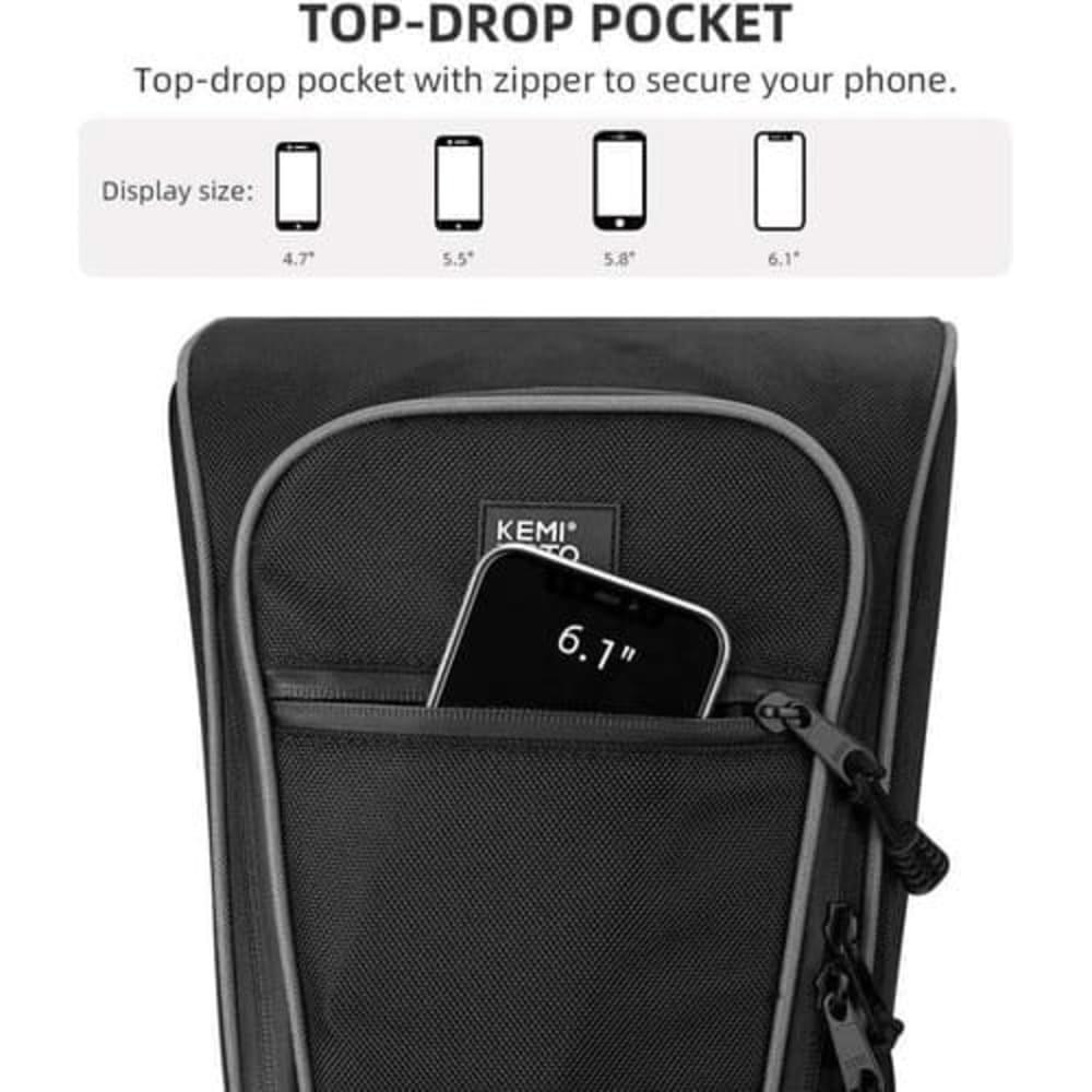 Top-drop pocket with zipper to secure your phone and keep it within easy reach.