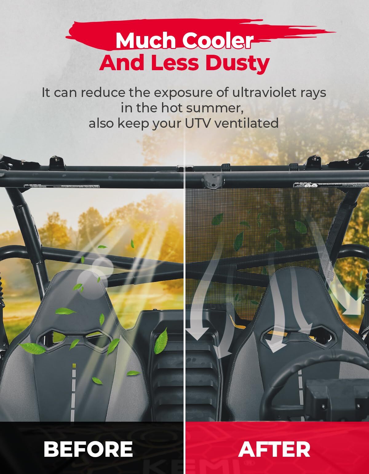 This rear window net can keep the air well-ventilated and prevent branches and debris. Much cooler and less dusty. It is cooler and more visual than a solid windshield, which keeps passenger seats shaded and perfect for hot sunny days.