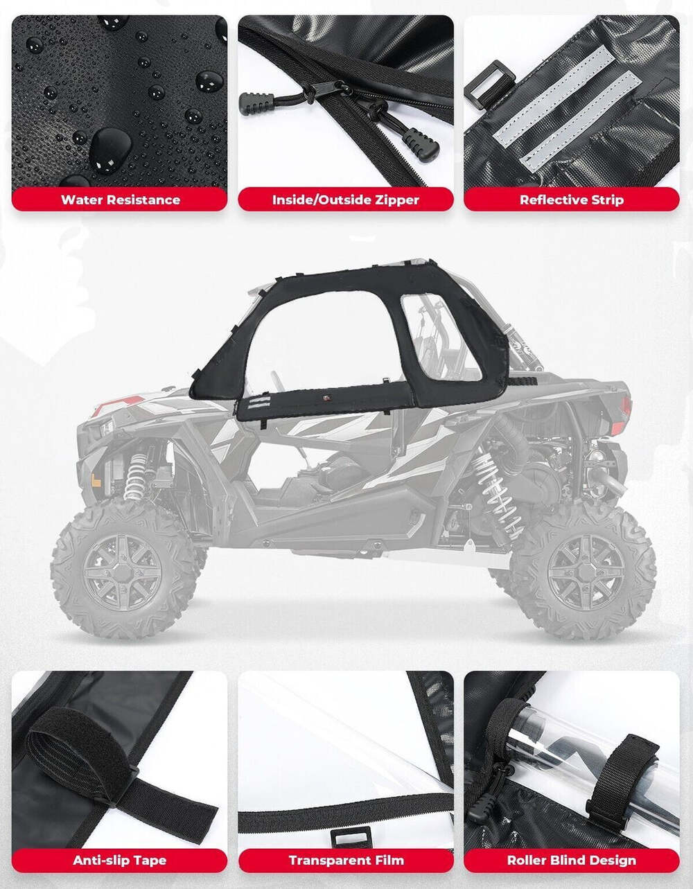 Autumn and winter are approaching, are you still shivering while sitting on your UTV? Maybe you need these RZR enclosure to keep you warm, it will keep the wind, leaves and debris from blowing right in your face, keeping the inside of your car dry and tidy. Based on past customer experience, we have improved the cab shell by replacing nylon zippers with resin zippers. The resin tooth zipper has higher tensile strength, is not easy to break, and is smoother. The soft door is designed with straps, which is convenient for you to install and remove, if you want to keep the air circulation, just pull the zipper, roll up the soft door, and secure it with two straps. The reflective strip design can help you easily find the position of the zipper at night, and remind oncoming vehicles to avoid collisions.