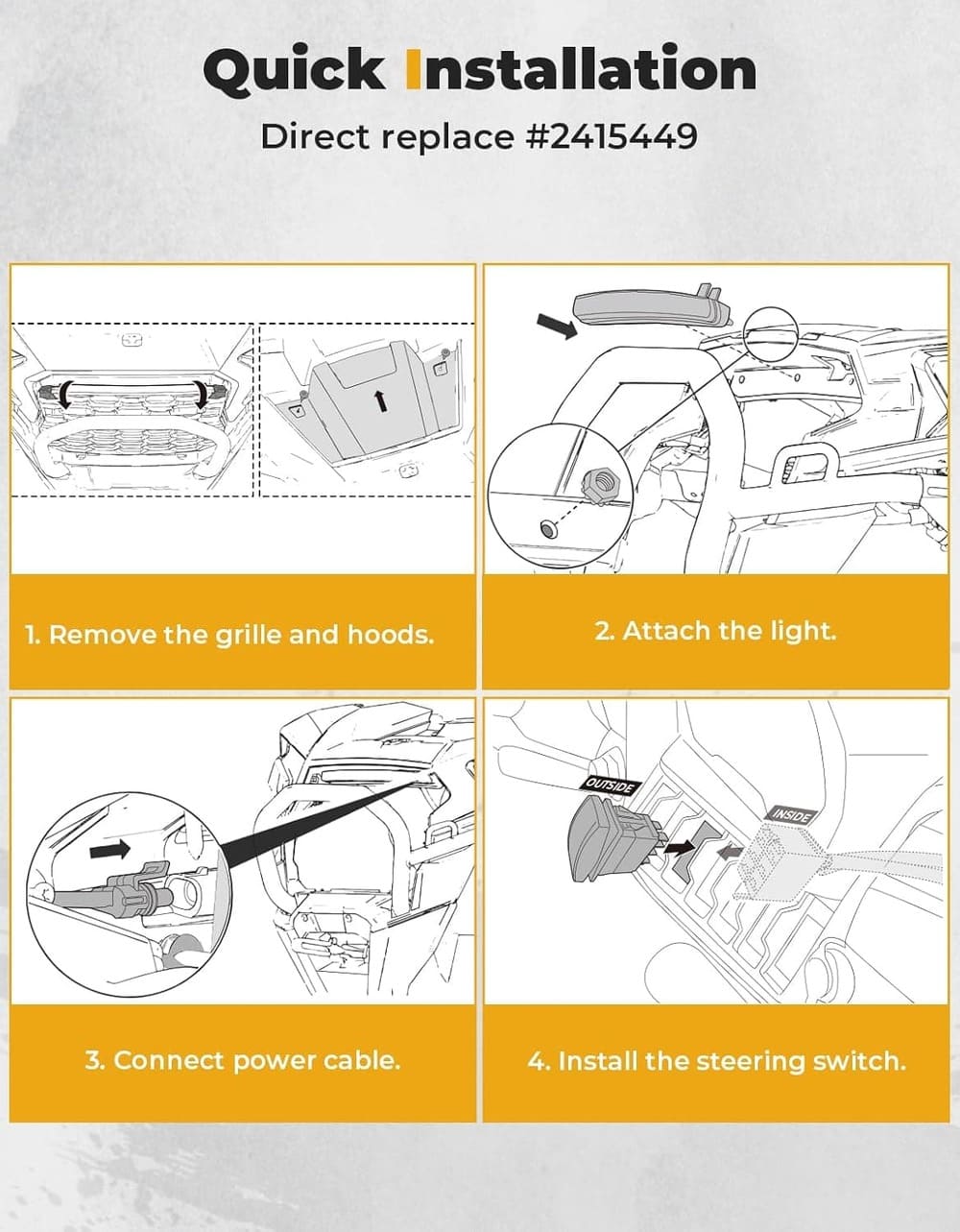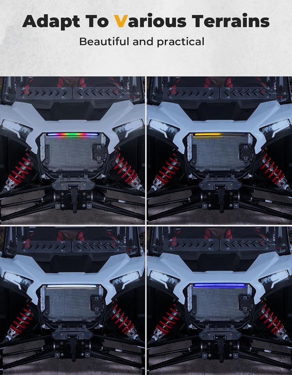 The RZR front lights enhance visibility by adding a central light source and offering multiple lighting modes, including daytime running, turn signal, and ambient lights. With the KEMIMOTO app, you can customize over 300 lighting modes and sync with music. It's the perfect addition to elevate your off-road experience.