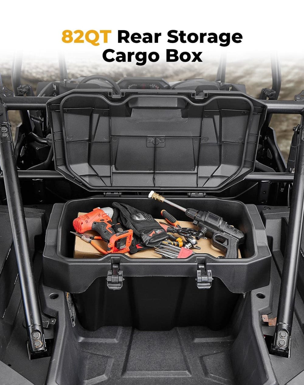The Polaris RZR XP 1000/4 1000 rear cargo box gives you a big 82QT of storage space. Perfect for all your stuff—tools, clothes, fishing gear, and more. Made from tough, UV-resistant plastic, this box is built to last. It's leak-proof and super strong. The rubber seal keeps out dust, mud, rain, and snow, so everything stays dry and clean. Installation is a breeze and it's easy to remove for quick cleaning. Grab this cargo box and make your adventures smooth and hassle-free.