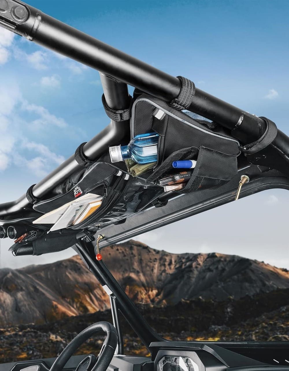 The Polaris RZR overhead storage bag offers organized storage for essentials like smartphones, jackets, and tools. Made from durable 1680D Oxford fabric, it's waterproof and protects against wear and tear. The bag includes a touch-screen-compatible transparent pocket for quick access to devices, making it a practical addition to your UTV.