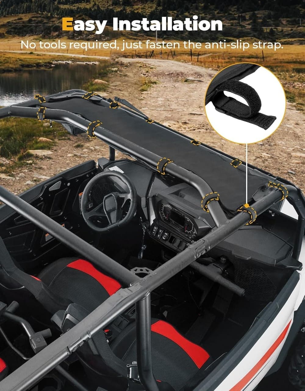 This KEMIMOTO UTV overhead storage bag is easy to install and remove, no tools or drilling required. Simply wrap the straps around the roll bar on the roof of the UTV to secure it in place.