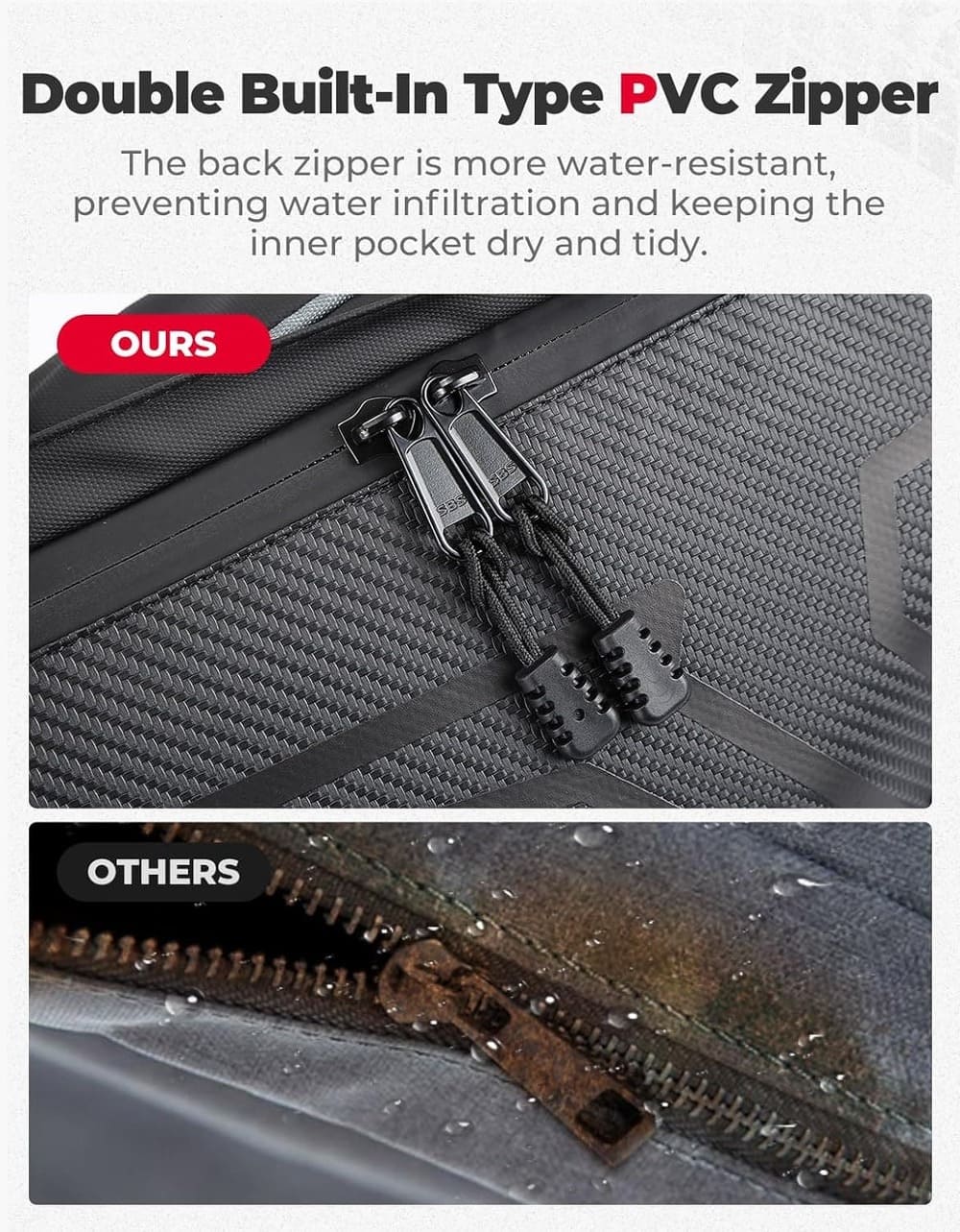 Double built-in type PVC zipper with flexible opening. Top cover of zipper can prevent the dirt from splashing onto the zipper and extend the life. The extended zipper rope is friendly for riders wearing gloves. The back zipper is more water-resistant, preventing water infiltration and keeping the inner pocket dry and tidy.