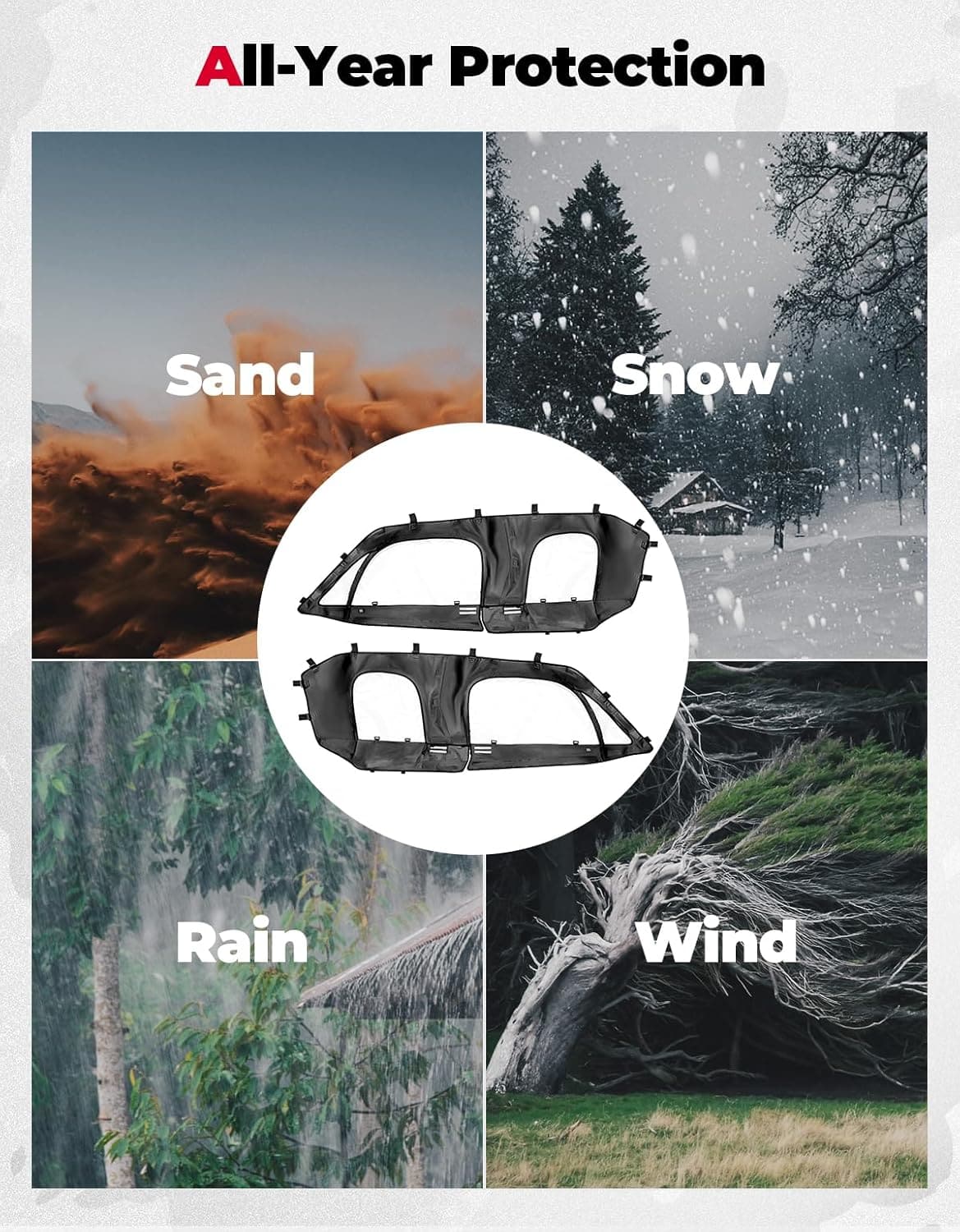 The Polaris RZR XP 4 1000 soft cab enclosure is your go-to solution for all-weather protection. It keeps you safe from sand, dust, and rain in the summer, and shields you from wind, snow, and cold in the winter. The roll-up window design makes it super easy to get in and out. It fits most side mirrors and front windshields perfectly. The enhanced nylon zipper is tough and keeps mud, water, and ice out. Simple, effective, and ready for any adventure—upgrade your ride today!