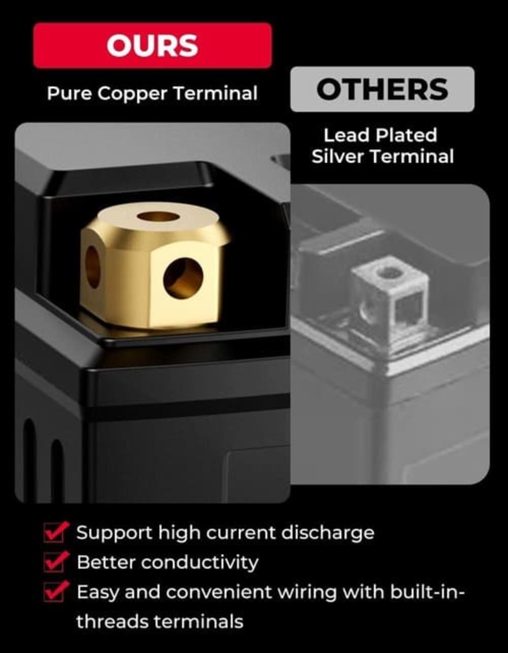 The sealed battery is featured with a power display and pure copper terminal to support high current discharge and better conductivity. The starting power of the battery 12v is 320A and the cold cranking ampere (CCA) is 120A.