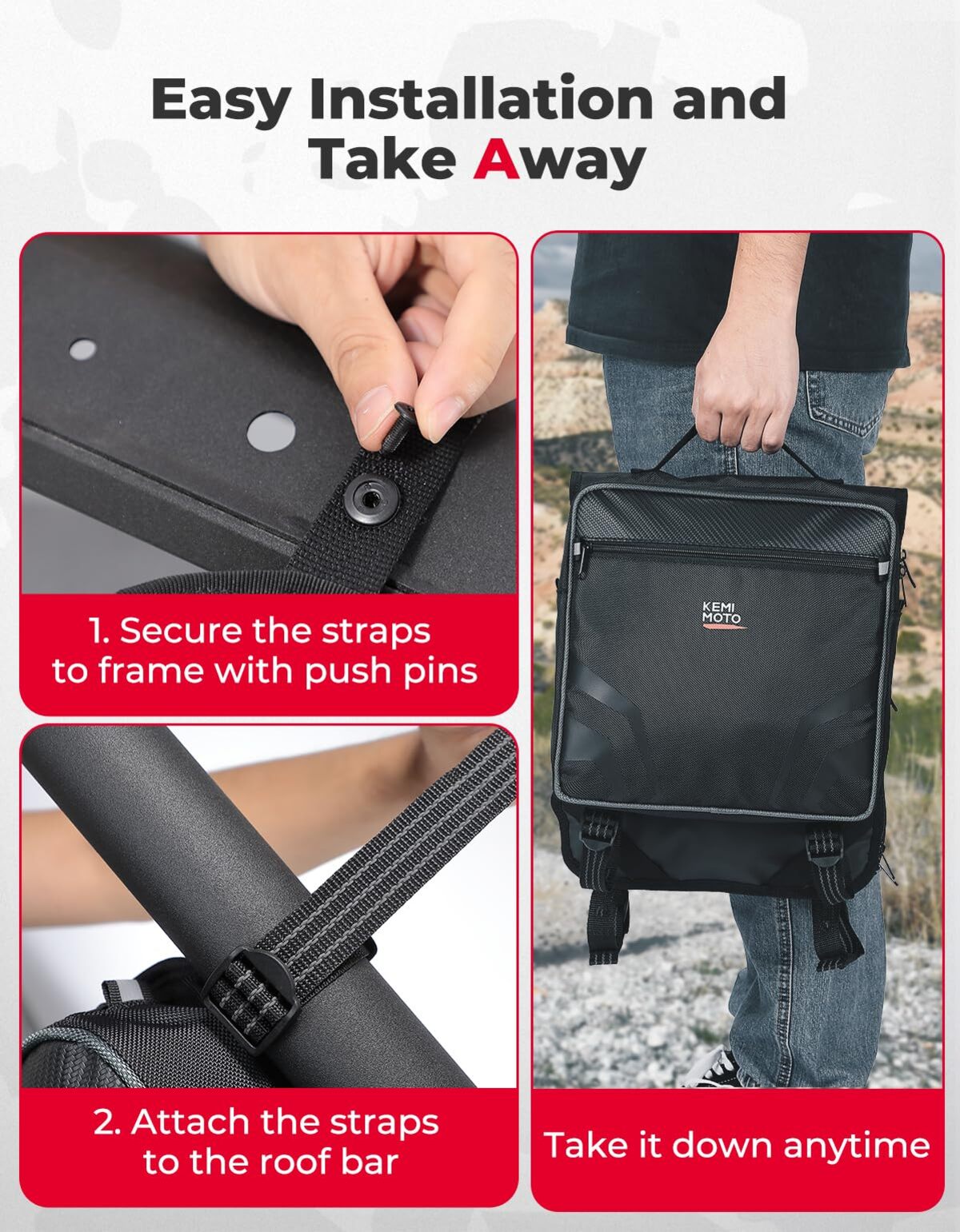 The storage bag is easy to be installed and disassembled, it only need to fix the strap with plastic pins and then attach the sticky straps to the roof bar. Additionally, with the handle, kemimoto saddlebag can also work as a handbag when you need to take it away.