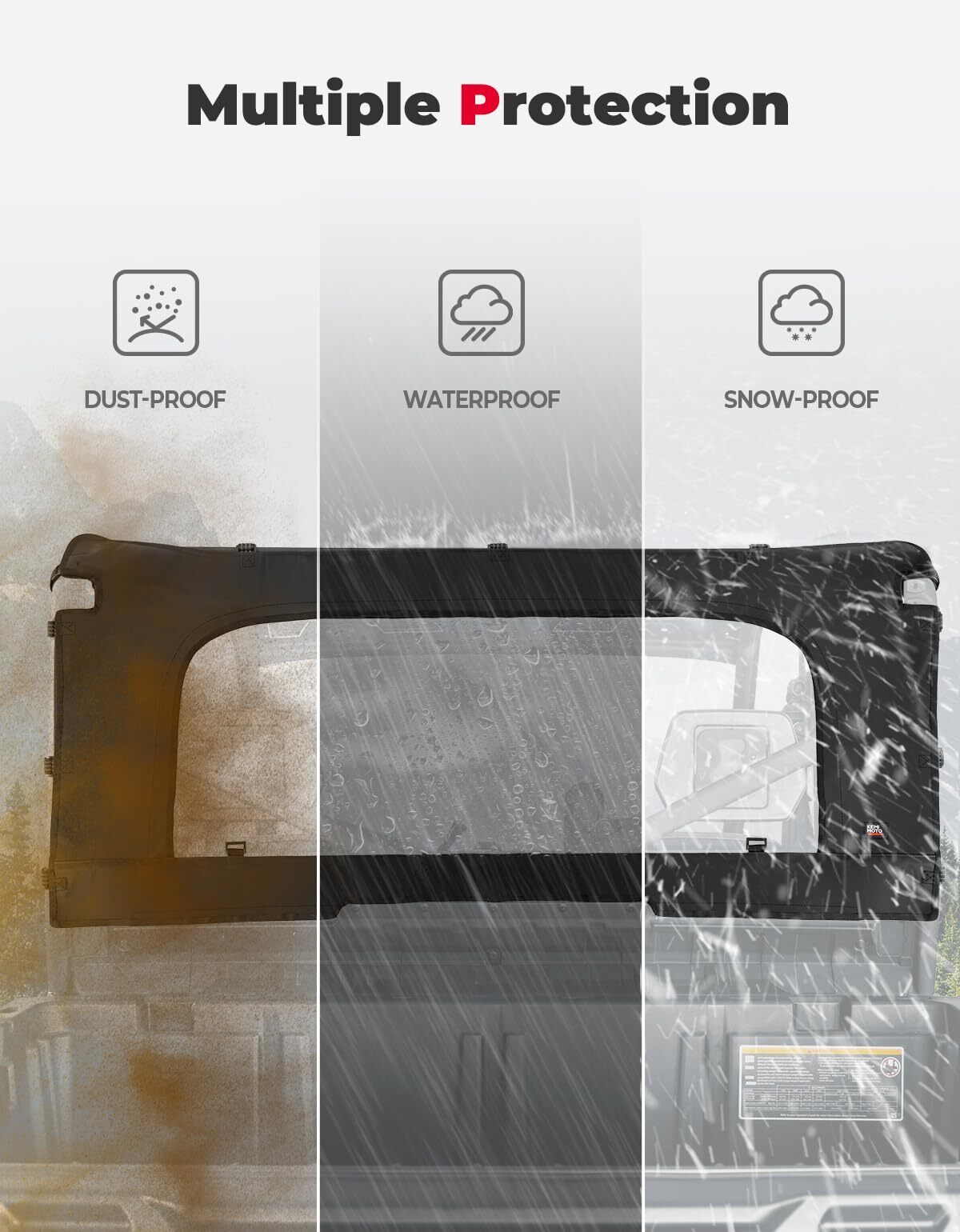 The rear windshield is made of PVC film and composite fabric, which is easy to clean, waterproof and durable. SAB custom nylon zippers provide additional durability and stability, ensuring that the rear window can withstand harsh outdoor conditions such as strong winds, snow, rain, and mud.