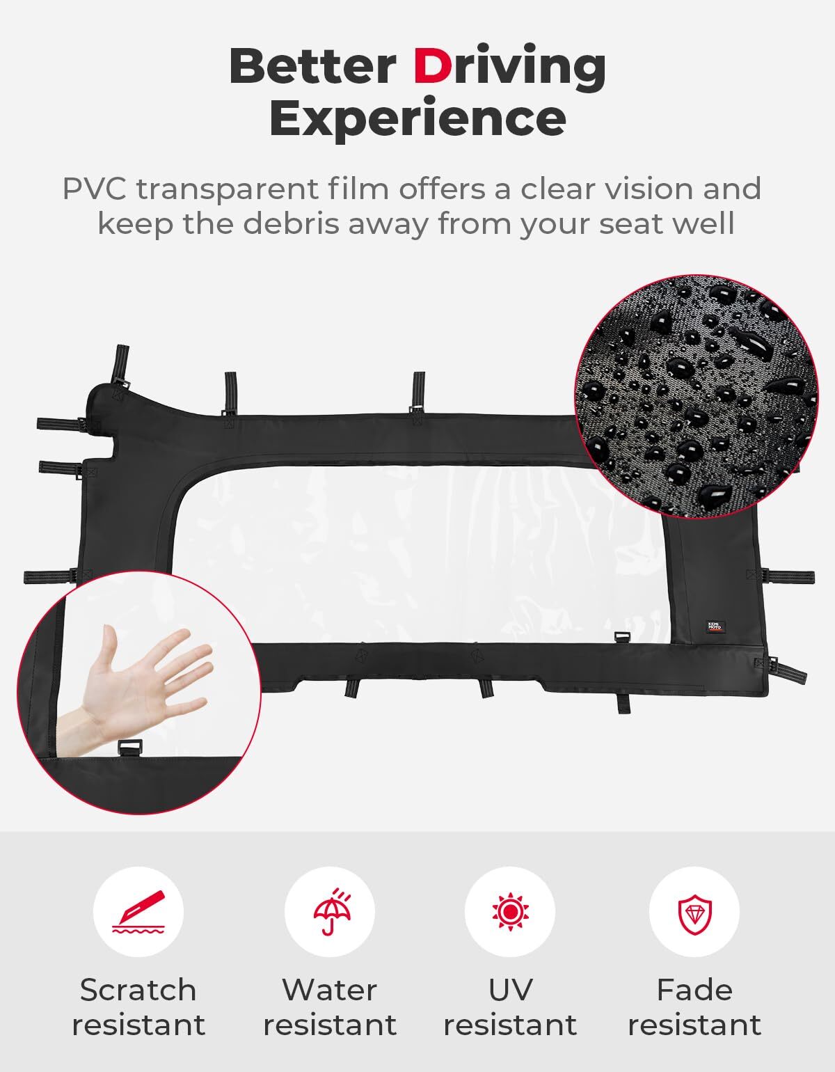 Kemimoto soft rear windshield is designed to provide you with a more comfortable and practical driving experience. The back windshield effectively protects you and your passengers from wind, dust, and other outdoor elements, ensuring a more enjoyable ride.