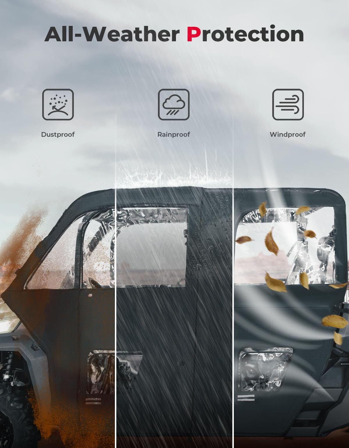The KEMIMOTO soft doors are made of waterproof PVC fabric and high-definition transparent film, and the sturdy and durable soft cab enclosure provides excellent weather protection. Our soft full windshield can effectively preventing rainwater, snow, sand, dust, leaves, and other debris from entering the UTV, keeping the cab clean and tidy, ensuring maximum driving comfort.