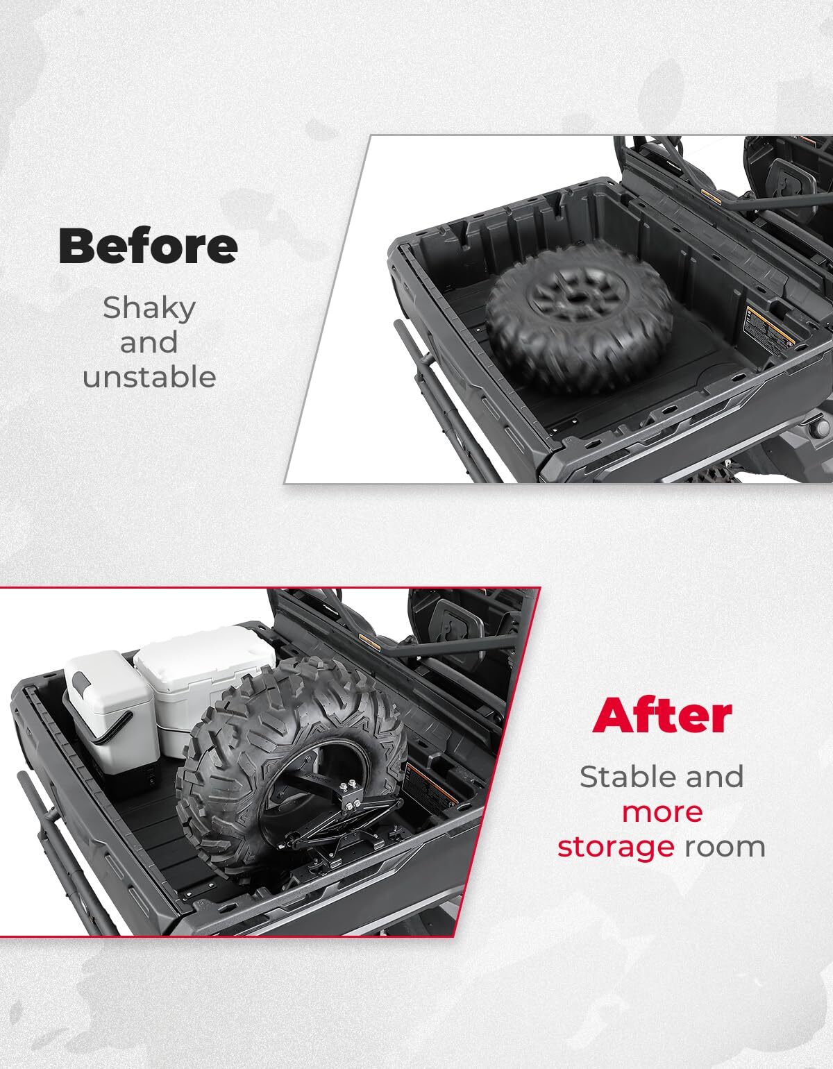 The Kemimoto Can-Am Defender spare tire holder is super easy to install. No drilling or tools are needed! It comes with everything you need: bracket, tire holder, jack, and all the hardware. This mount fits tires from 26" to 33" and has plenty of room for bigger wheels and tires. Just make sure your tire is tight against the cargo box to keep it secure. You can place it anywhere on the left, right, or front rails of your cargo box. Keep your spare tire safe and within reach without any hassle.