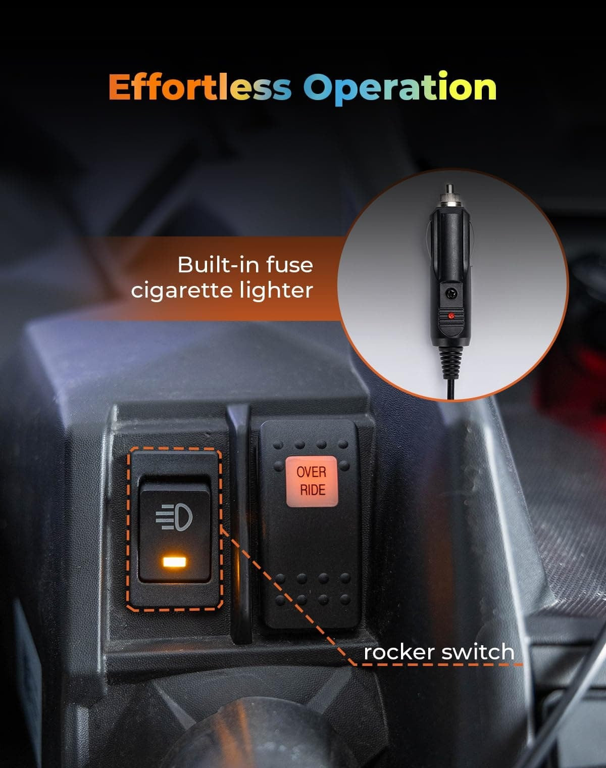 Comes with a rocker switch for easy control. It is powered by cigarette lighter so no complicated wiring required. Don't worry about extra wiring and installation hardware. These lights come with all the necessary hardware and wiring equipment for an easy and painless installation. (Windshield not included)
