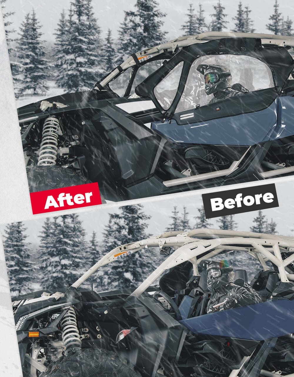The Kemimoto Can Am Maverick X3 Soft Cab Enclosure provides protection against sun, rain, and dust during summer, and against wind, snow, and cold during winter. The transparent film can be rolled up for ventilation when needed.