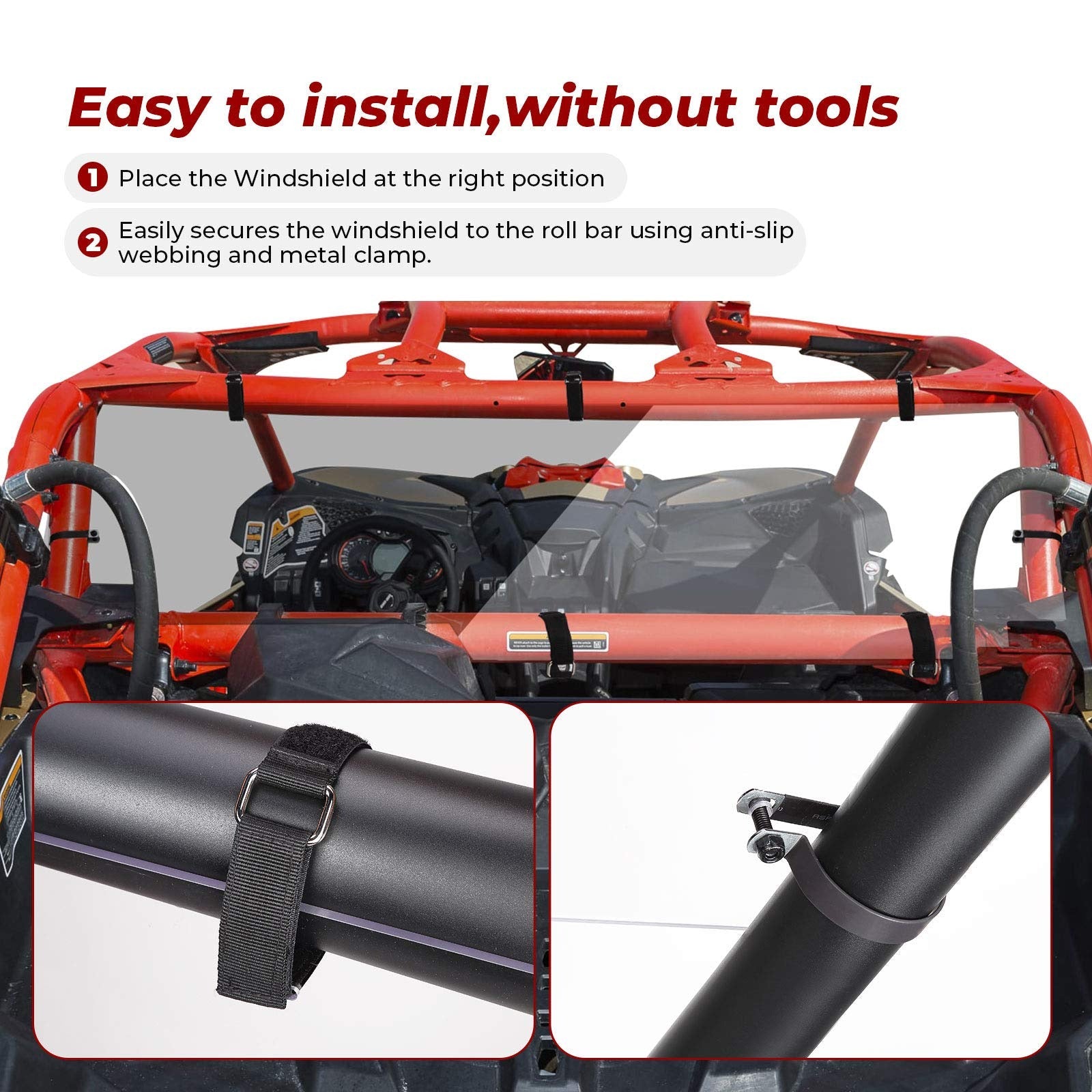 KEMIMOTO x3 back windshield is made of 1/4 inch thick polycarbonates, which is 250 times stronger than glass, no more worrying about cracking or breaking down during driving. With UV-resistant layer, x3 back windshield is more antioxidant.