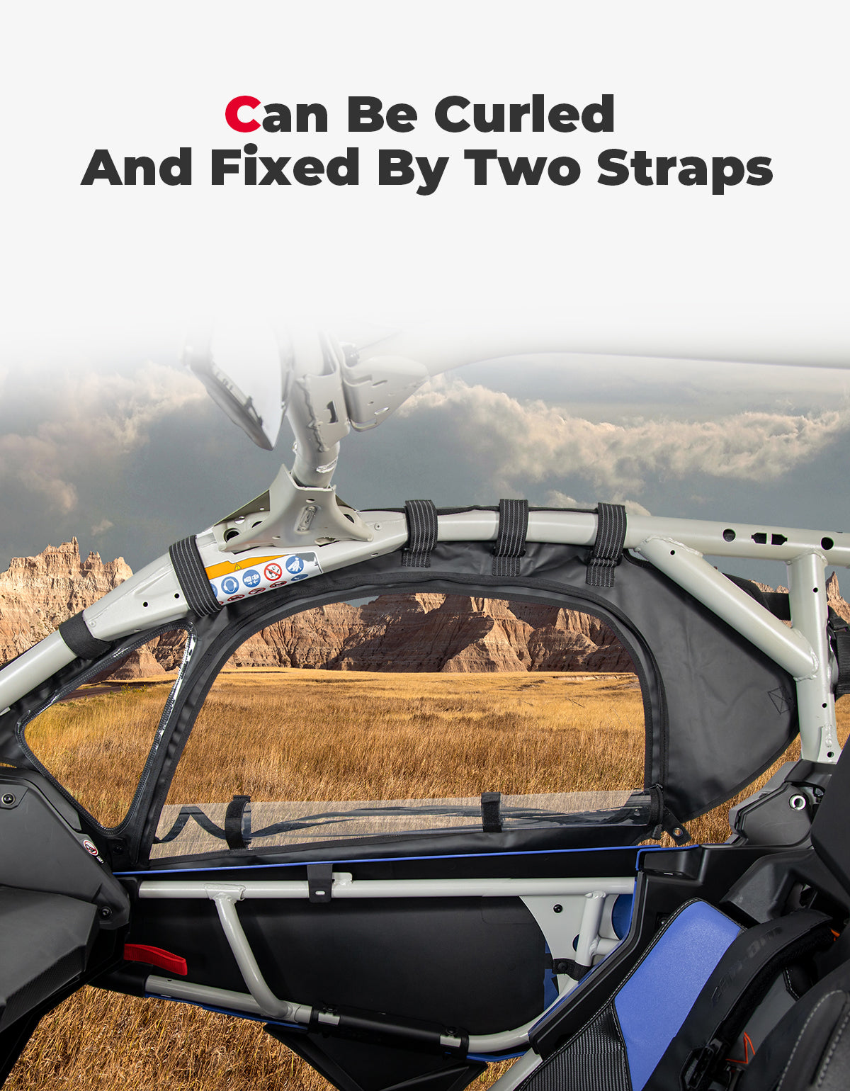 The Kemimoto Can Am Maverick X3 Soft Cab Enclosure provides protection against sun, rain, and dust during summer, and against wind, snow, and cold during winter. The transparent film can be rolled up for ventilation when needed.