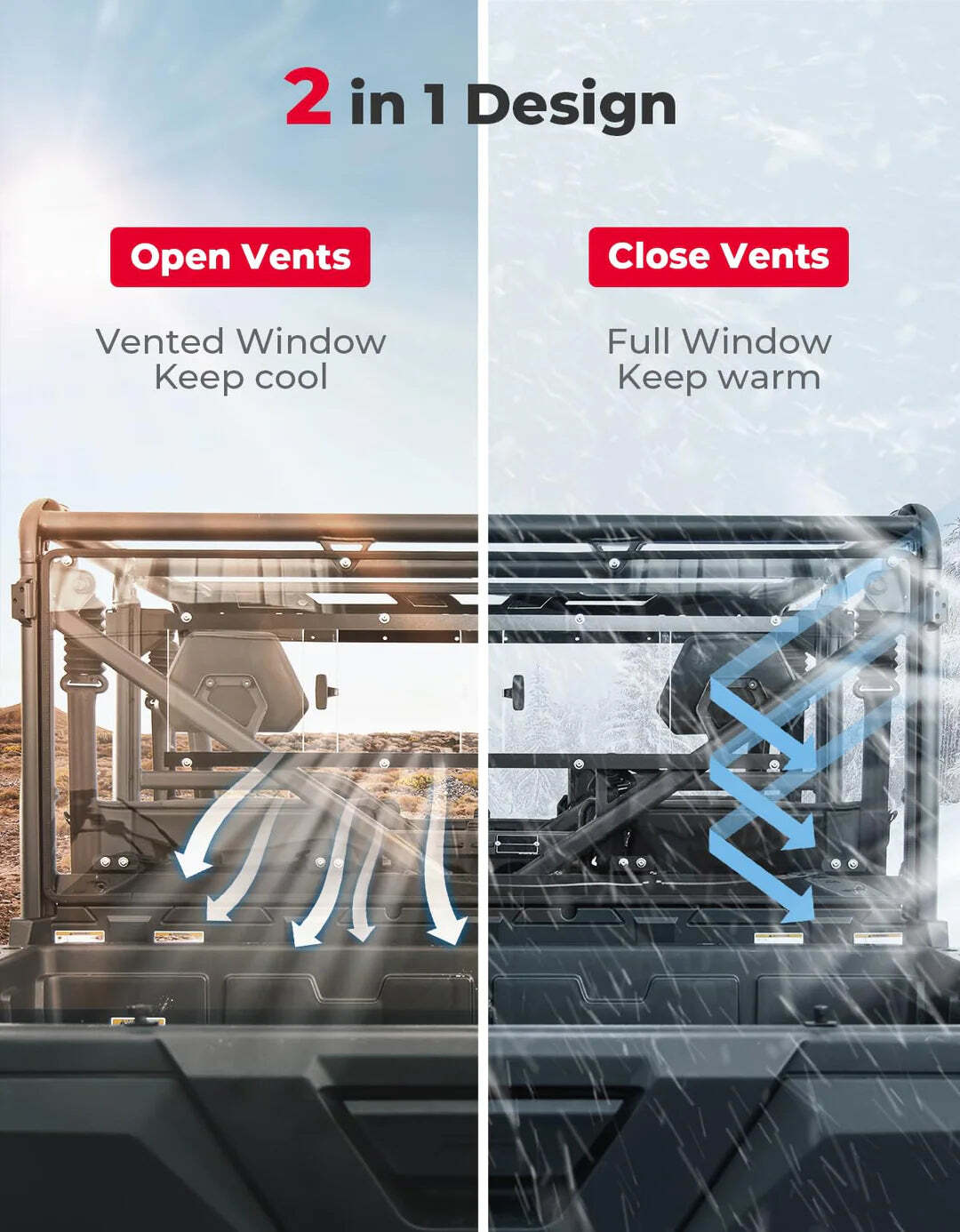 2 in 1 design for year-round riding. Works as both vented rear window and full window . Adjustable sliding vents allow cool air flow entering into your utv in the Summer. In the Winter, you can close the vent to get a full window against the cold wind.